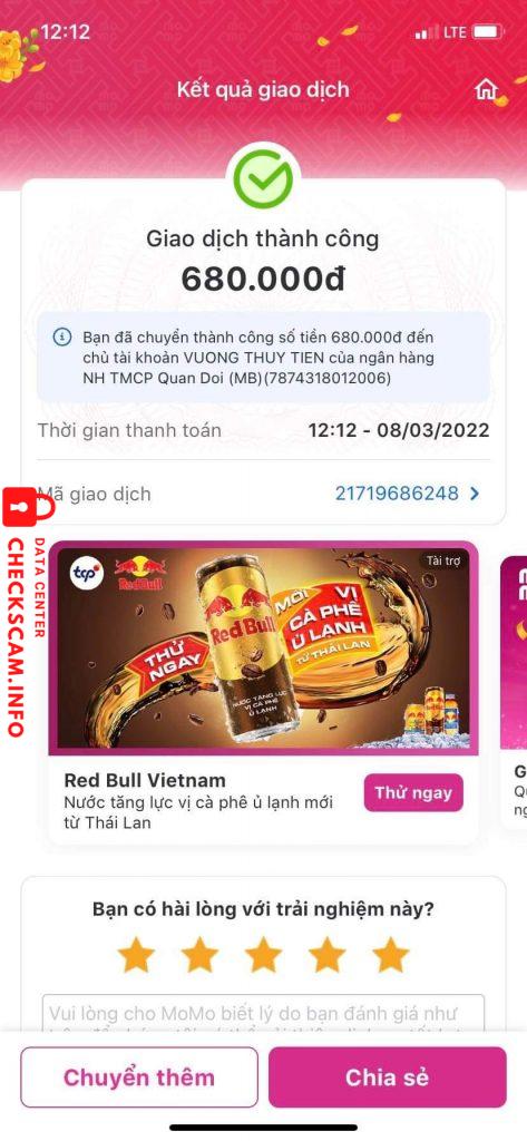 Scammer Alert: Vuong Thuy Tien Reported: November 16, 2024 Scammer Information Full Name: Vuong Thuy Tien Payment Gate: MB Payment Account: 7874318012006 Category: Marketplace scams Source: Checkscam Evidence Files Report Description Bạn ấy đã lừa của bọn em tiền ạ còn mấy bạn khác nữa mọi người nên tránh nhaaa giờ nó lấy nick Nguyen Ha Nhi đi scam tiếp đó Comments Your comment Add Comment No comments yet. Be the first to share your experience with this scammer.