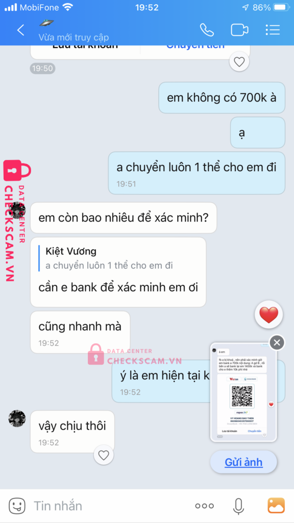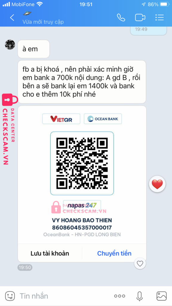 Scammer Alert: Vy Hoàng Bảo Thiên Reported: March 7, 2025 Scammer Information Full Name: Vy Hoàng Bảo Thiên Payment Gate: OceanBank Payment Account: 86086045357000017 Category: Marketplace scams Source: Checkscam Evidence Files Report Description tôi và một người gdtg tổng giá trị 700k đến lúc done acc thì ng gdtg báo fb bị khoá và cần xác minh để gởi lại tiền bằng cách bank thêm 700k Comments Your comment Add Comment No comments yet. Be the first to share your experience with this scammer.