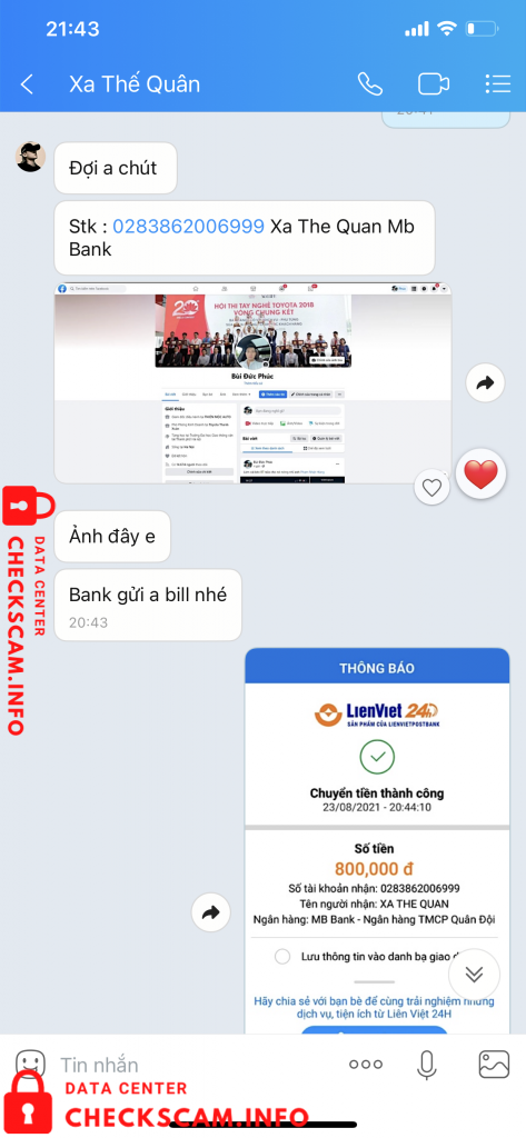 Scammer Alert: Xa Thế Quân Reported: November 16, 2024 Scammer Information Full Name: Xa Thế Quân Phone Number: 0868980095 Payment Gate: MB bank Payment Account: 0283862006999 Category: Marketplace scams Source: Checkscam Evidence Files Report Description Lừa đảo dịch vụ fb ck xong mất hút Comments Your comment Add Comment No comments yet. Be the first to share your experience with this scammer.