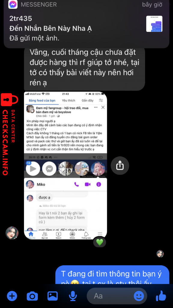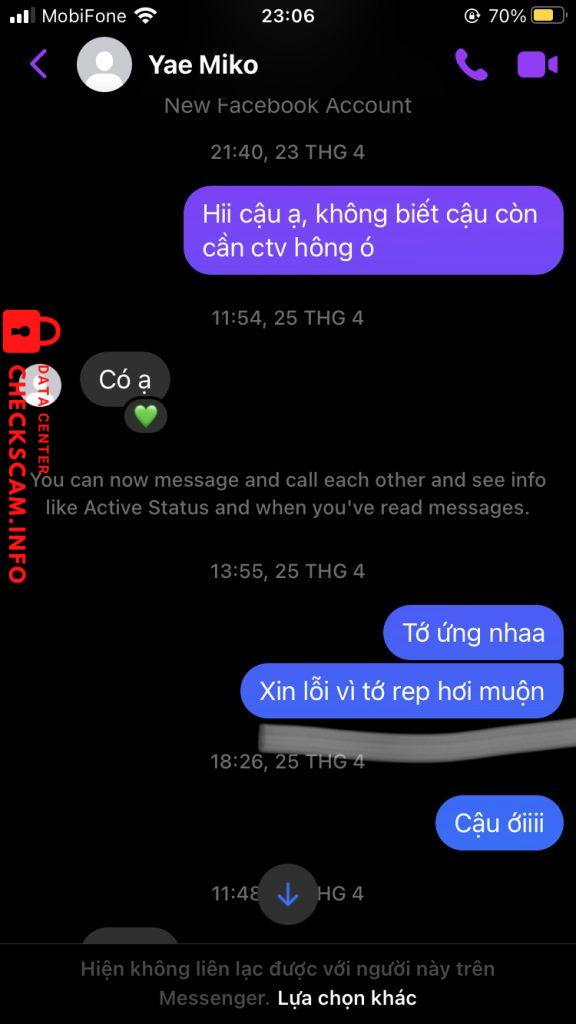 การแจ้งเตือนมิจฉาชีพ: LE THI KIM MAI รายงานแล้ว: November 16, 2024 ข้อมูลมิจฉาชีพ ชื่อเต็ม: LE THI KIM MAI ช่องทางการชำระเงิน: Vietcombank บัญชีการชำระเงิน: 1027552212 หมวดหมู่: การหลอกลวงในตลาดออนไลน์ แหล่งที่มา: Checkscam ไฟล์หลักฐาน คำอธิบายรายงาน Khoảng 1 tháng gần đây bạn Yae Miko có đăng bài tuyển ctv và t cũng với một số bạn khác có ứng và gom ord cũng được kha khá. Tổng lại hết là 6tr603 và bạn đã ôm tiền sủi mất tâm? ความคิดเห็น ความคิดเห็นของคุณ เพิ่มความคิดเห็น ยังไม่มีความคิดเห็น เป็นคนแรกที่แบ่งปันประสบการณ์กับมิจฉาชีพรายนี้