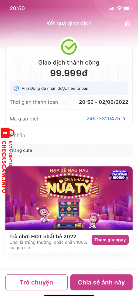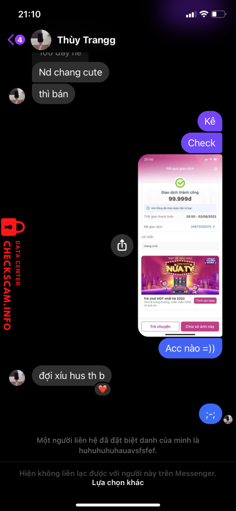 Cảnh báo kẻ lừa đảo: Anh Dũng Đã báo cáo: November 16, 2024 Thông tin kẻ lừa đảo Họ và tên: Anh Dũng Số điện thoại: 0936995746 Cổng thanh toán: MOMO Tài khoản thanh toán: 0936995746 Danh mục: Lừa đảo mua bán Nguồn: Checkscam Tệp bằng chứng Mô tả báo cáo Scam bán acc free fire cần ad xích ❤️? Bình luận Bình luận của bạn Thêm bình luận Chưa có bình luận nào. Hãy là người đầu tiên chia sẻ kinh nghiệm của bạn với kẻ lừa đảo này.
