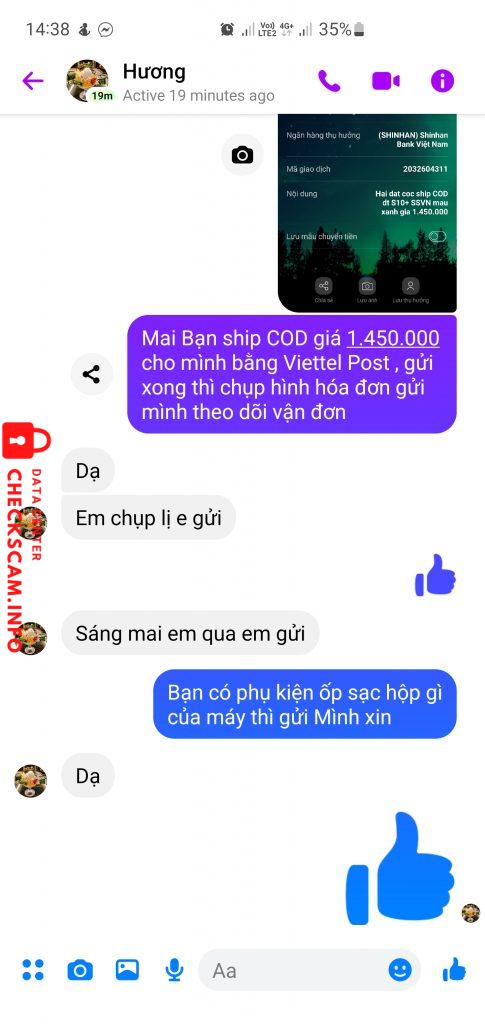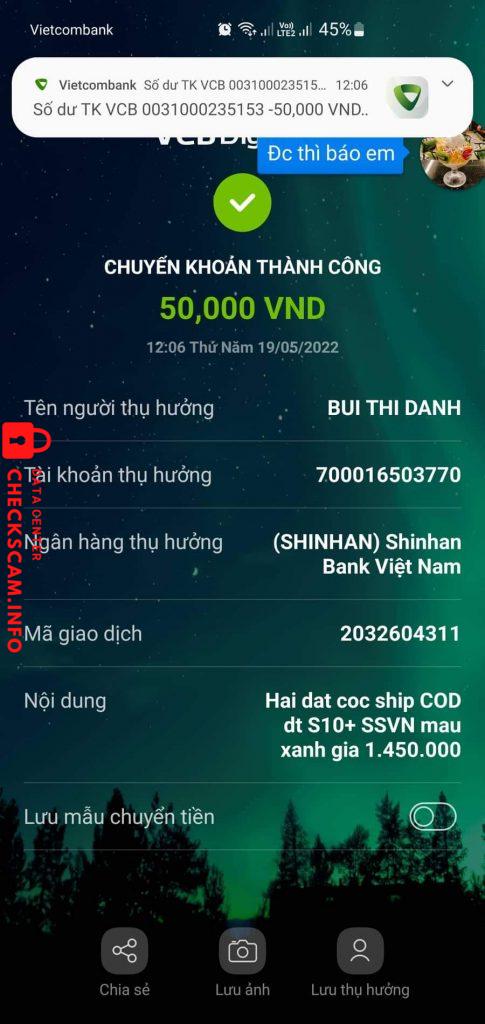 Cảnh báo kẻ lừa đảo: BUI THI DANH Đã báo cáo: November 16, 2024 Thông tin kẻ lừa đảo Họ và tên: BUI THI DANH Cổng thanh toán: SHINHAN BANK Tài khoản thanh toán: 700016503770 Danh mục: Lừa đảo mua bán Nguồn: Checkscam Tệp bằng chứng Mô tả báo cáo Bán xác SS S10+ nhưng cọc tiền không gửi máy Bình luận Bình luận của bạn Thêm bình luận Chưa có bình luận nào. Hãy là người đầu tiên chia sẻ kinh nghiệm của bạn với kẻ lừa đảo này.