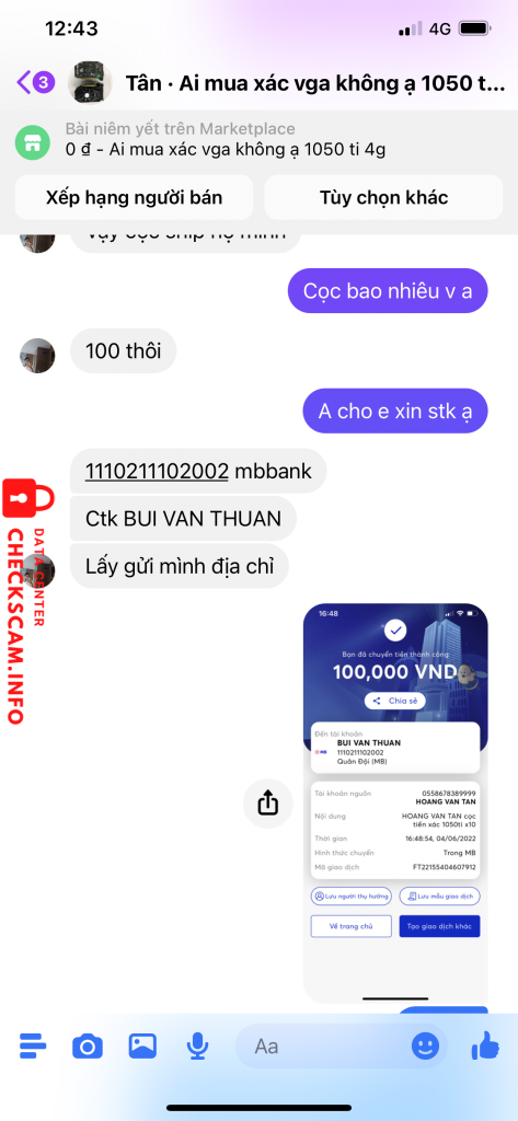 Cảnh báo kẻ lừa đảo: Bùi văn thuận Đã báo cáo: November 16, 2024 Thông tin kẻ lừa đảo Họ và tên: Bùi văn thuận Cổng thanh toán: Mb bank Tài khoản thanh toán: 1110211102002 Danh mục: Lừa đảo mua bán Nguồn: Checkscam Tệp bằng chứng Mô tả báo cáo Lừa đảo chiếm đoạt tiền cọc Bình luận Bình luận của bạn Thêm bình luận Chưa có bình luận nào. Hãy là người đầu tiên chia sẻ kinh nghiệm của bạn với kẻ lừa đảo này.