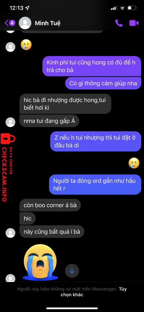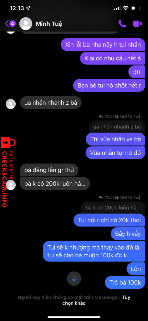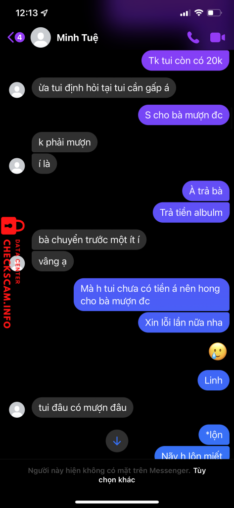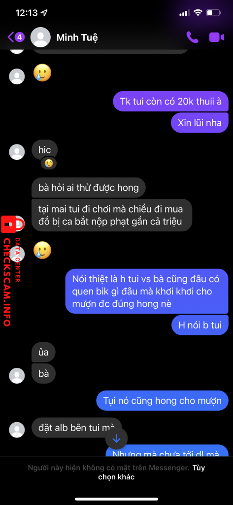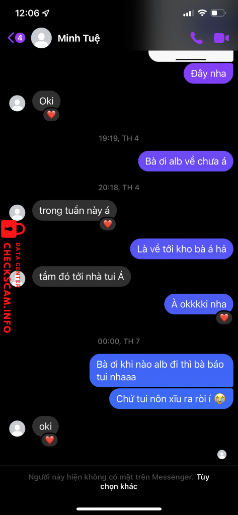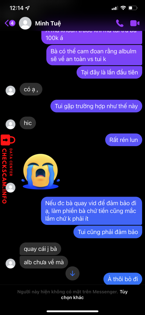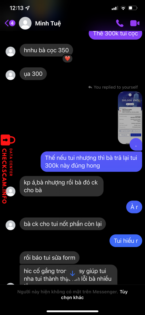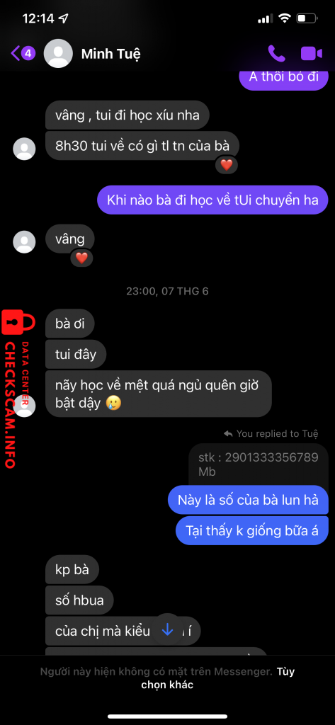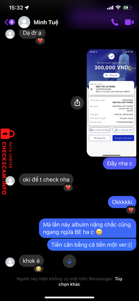 Cảnh báo kẻ lừa đảo: Đào Thị Lệ Hằng Đã báo cáo: November 16, 2024 Thông tin kẻ lừa đảo Họ và tên: Đào Thị Lệ Hằng Cổng thanh toán: BIDV Tài khoản thanh toán: 62210000234468 Danh mục: Lừa đảo mua bán Nguồn: Checkscam Tệp bằng chứng Mô tả báo cáo Lừa đảo tiền albulm proof Bình luận Bình luận của bạn Thêm bình luận Chưa có bình luận nào. Hãy là người đầu tiên chia sẻ kinh nghiệm của bạn với kẻ lừa đảo này.