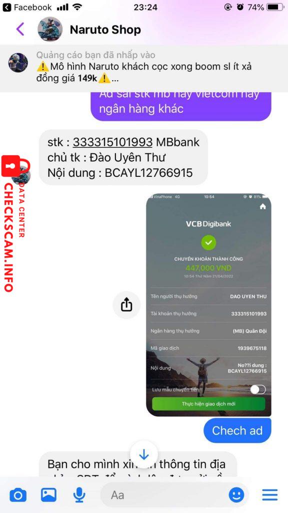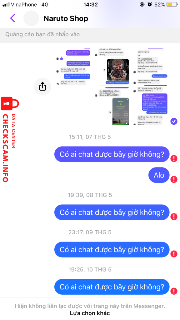 Cảnh báo kẻ lừa đảo: ĐÀO UYÊN THƯ Đã báo cáo: November 16, 2024 Thông tin kẻ lừa đảo Họ và tên: ĐÀO UYÊN THƯ Cổng thanh toán: Mb bank Tài khoản thanh toán: 333315101993 Danh mục: Lừa đảo mua bán Nguồn: Checkscam Tệp bằng chứng Mô tả báo cáo Lừa đảo ae tránh nhé giúp minh shopnaruto , minh ham giá rẻ Bình luận Bình luận của bạn Thêm bình luận Chưa có bình luận nào. Hãy là người đầu tiên chia sẻ kinh nghiệm của bạn với kẻ lừa đảo này.