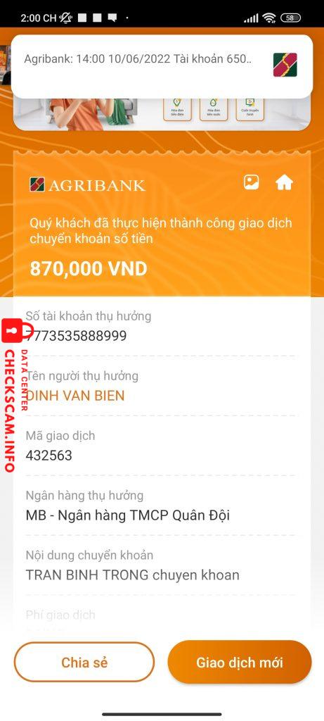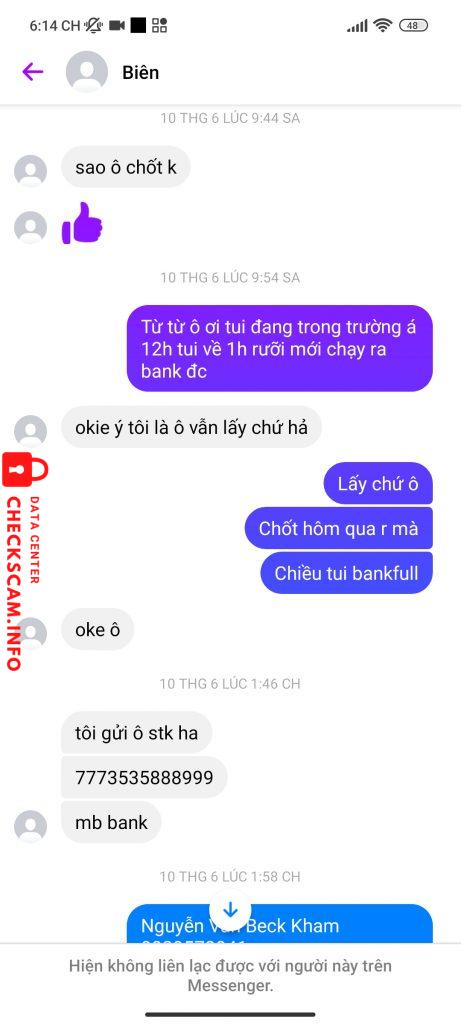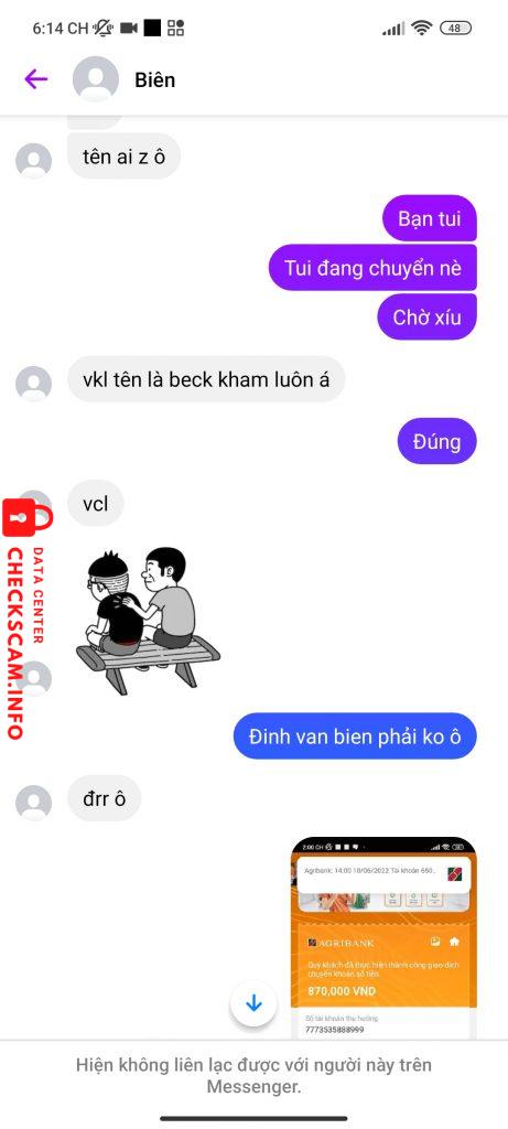 Cảnh báo kẻ lừa đảo: DINH VAN BIEN Đã báo cáo: November 16, 2024 Thông tin kẻ lừa đảo Họ và tên: DINH VAN BIEN Cổng thanh toán: MB Tài khoản thanh toán: 7773535888999 Danh mục: Lừa đảo mua bán Nguồn: Checkscam Tệp bằng chứng Mô tả báo cáo Lừa đảo 870k tiền mua bán truyện Bình luận Bình luận của bạn Thêm bình luận Chưa có bình luận nào. Hãy là người đầu tiên chia sẻ kinh nghiệm của bạn với kẻ lừa đảo này.