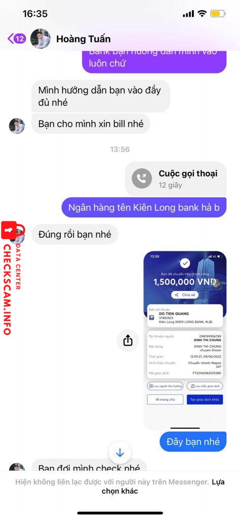 Cảnh báo kẻ lừa đảo: Đỗ Tiến Quang Đã báo cáo: November 16, 2024 Thông tin kẻ lừa đảo Họ và tên: Đỗ Tiến Quang Cổng thanh toán: Kiên Long Bank Tài khoản thanh toán: 37882823 Danh mục: Lừa đảo mua bán Nguồn: Checkscam Tệp bằng chứng Mô tả báo cáo Đỗ Tiến Quang lừa đảo 1 triệu 8 tiền mở Facebook STK lừa đảo: 37882823 – Kiên Long Bank CTK lừa đảo: Đỗ Tiến Quang Bình luận Bình luận của bạn Thêm bình luận Chưa có bình luận nào. Hãy là người đầu tiên chia sẻ kinh nghiệm của bạn với kẻ lừa đảo này.