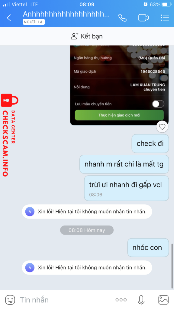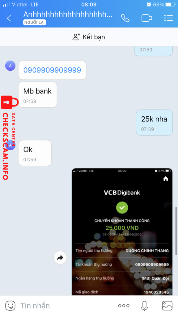 Cảnh báo kẻ lừa đảo: DUONG CHI THANG Đã báo cáo: November 16, 2024 Thông tin kẻ lừa đảo Họ và tên: DUONG CHI THANG Cổng thanh toán: mb bankk Tài khoản thanh toán: 0909909909999 Danh mục: Lừa đảo mua bán Nguồn: Checkscam Tệp bằng chứng Mô tả báo cáo scam hma đúng 25k phèn vcl Bình luận Bình luận của bạn Thêm bình luận Chưa có bình luận nào. Hãy là người đầu tiên chia sẻ kinh nghiệm của bạn với kẻ lừa đảo này.