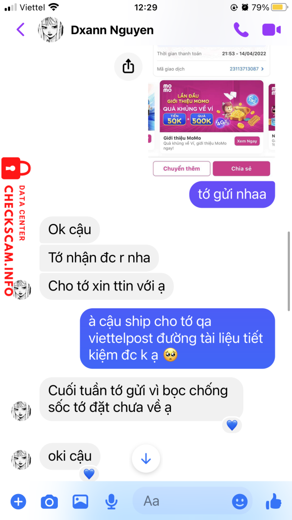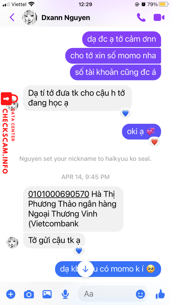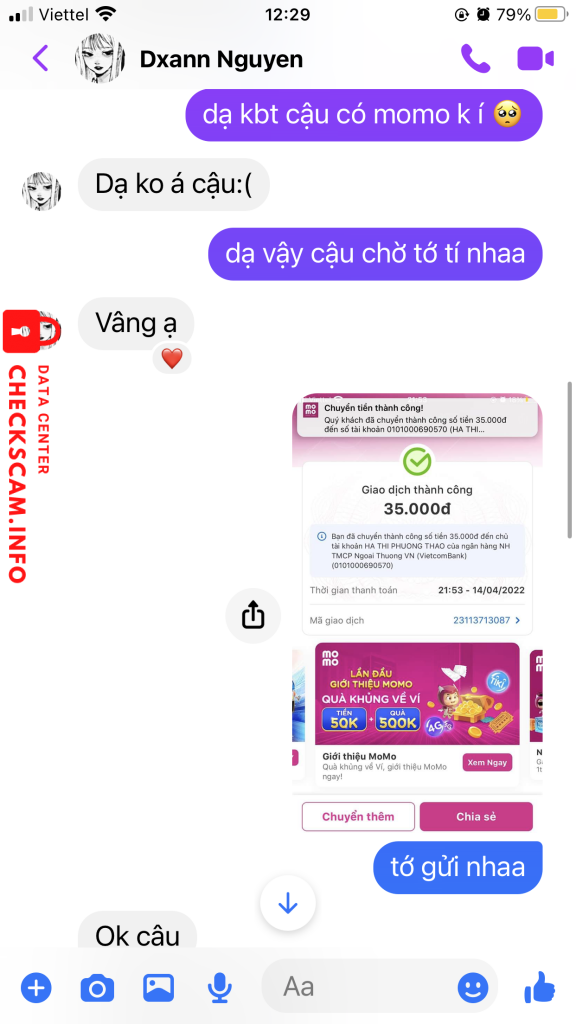 Cảnh báo kẻ lừa đảo: Hà Thị Phương Thảo Đã báo cáo: November 16, 2024 Thông tin kẻ lừa đảo Họ và tên: Hà Thị Phương Thảo Cổng thanh toán: Vietcombank Tài khoản thanh toán: 0101000690570 Danh mục: Lừa đảo mua bán Nguồn: Checkscam Tệp bằng chứng Mô tả báo cáo Lừa đảo mua bán truyện tranh Bình luận Bình luận của bạn Thêm bình luận Chưa có bình luận nào. Hãy là người đầu tiên chia sẻ kinh nghiệm của bạn với kẻ lừa đảo này.