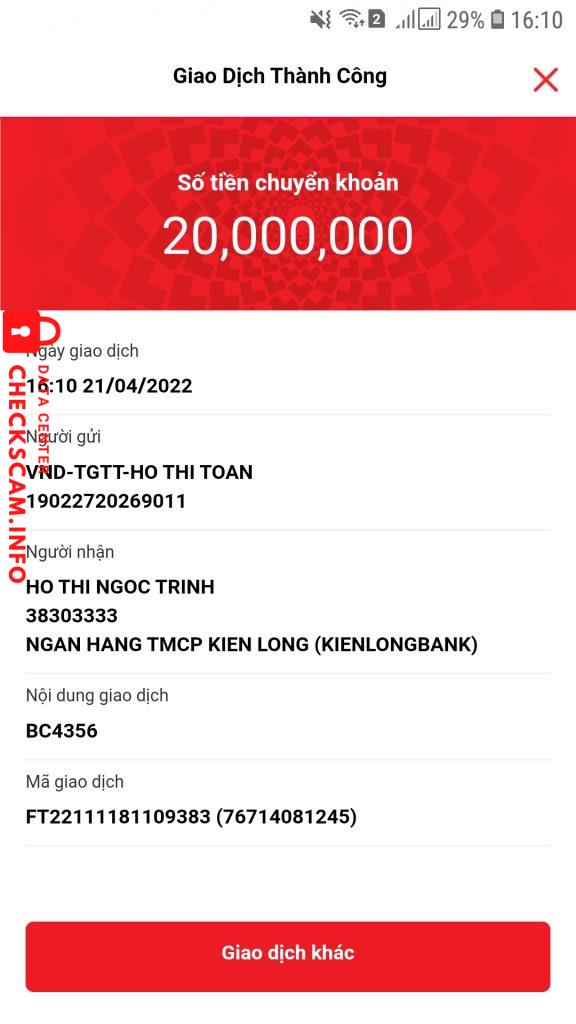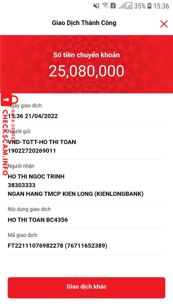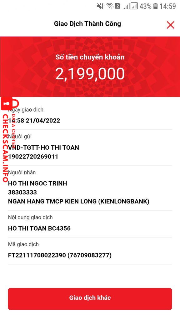 Cảnh báo kẻ lừa đảo: HO THI NGOC TRINH