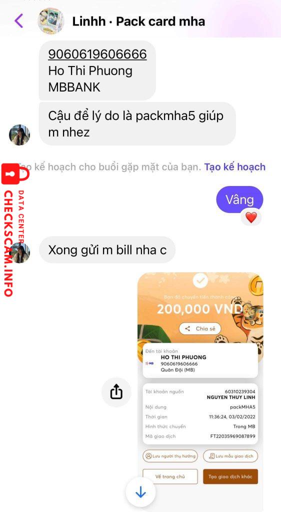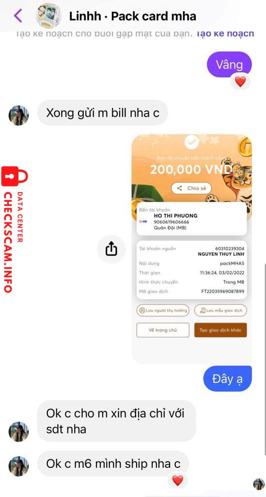 Cảnh báo kẻ lừa đảo: Hồ Thị Phương Đã báo cáo: November 16, 2024 Thông tin kẻ lừa đảo Họ và tên: Hồ Thị Phương Cổng thanh toán: MB Bank Tài khoản thanh toán: 9060619606666 Danh mục: Lừa đảo mua bán Nguồn: Checkscam Tệp bằng chứng Mô tả báo cáo Bị Phương scam 200k vào mùng 4 tết Bình luận Bình luận của bạn Thêm bình luận Chưa có bình luận nào. Hãy là người đầu tiên chia sẻ kinh nghiệm của bạn với kẻ lừa đảo này.