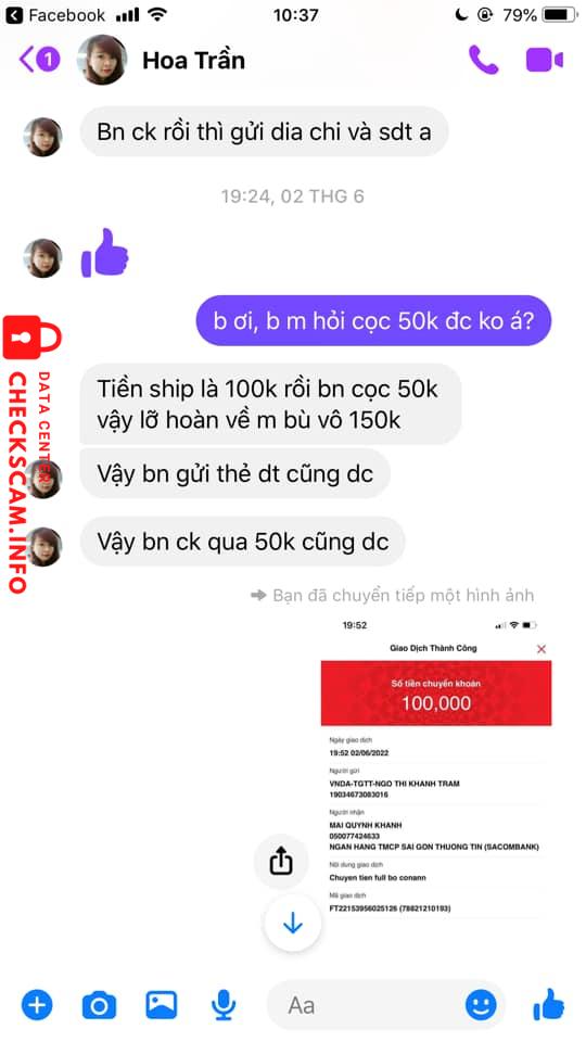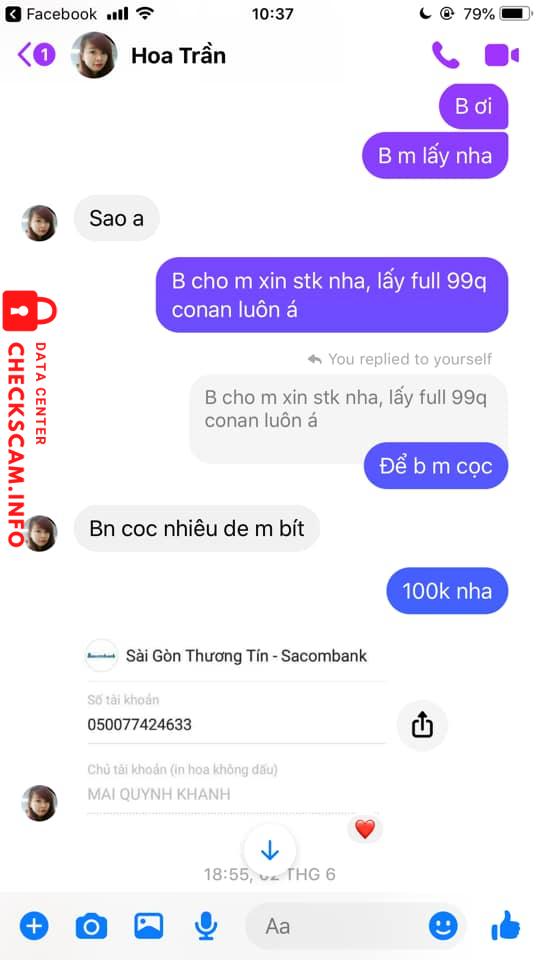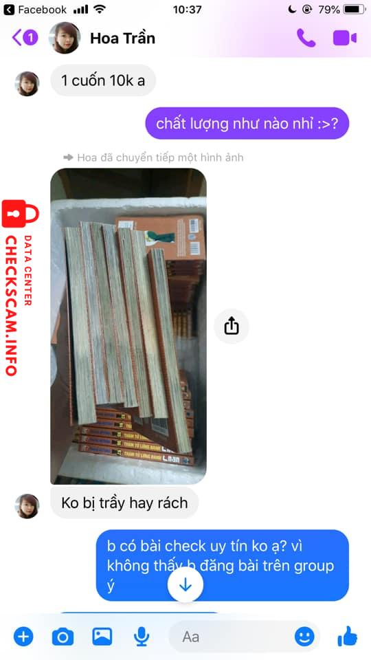 Bạn Ngọc đăng bài mua 99 quyển conan, bạn Hoa Trần vào bình luận kêu nhắn tin cho bạn Hoa Trần (Bây giờ bạn Hoa Trần xóa bình luận rồi), bạn Ngọc nhắn tin cho bạn Hoa Trần và 2 bạn trao đổi qua lại, cuối cùng bạn Ngọc chuyển 100.000 tiền cọc trước cho bạn Hoa Trần, bạn Hoa Trần nói mai sẽ giao hàng nhưng sau đó thì nhắn tin cho bạn Hoa Trần thì bạn không rep và đến giờ bạn Ngọc vẫn chưa có hàng.