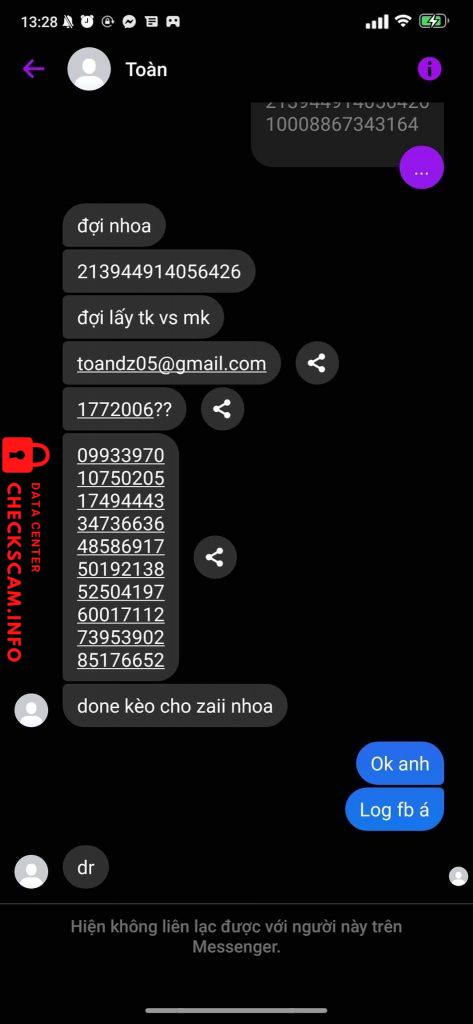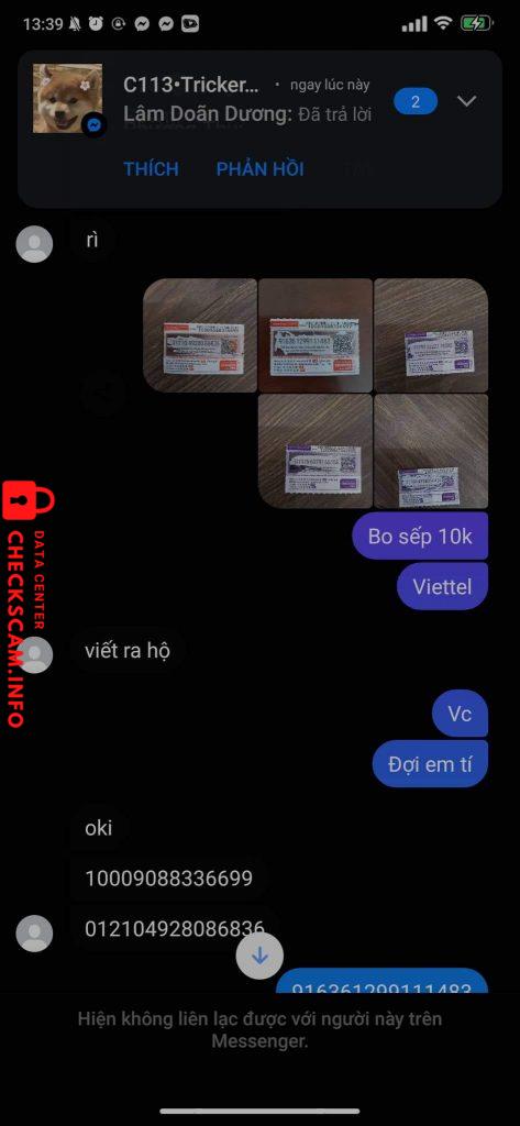 Cảnh báo kẻ lừa đảo: Hoàng Anh Đã báo cáo: November 16, 2024 Thông tin kẻ lừa đảo Họ và tên: Hoàng Anh Cổng thanh toán: 0582618911 Tài khoản thanh toán: 0582618911 Danh mục: Lừa đảo mua bán Nguồn: Checkscam Tệp bằng chứng Mô tả báo cáo Scam 160k Bình luận Bình luận của bạn Thêm bình luận Chưa có bình luận nào. Hãy là người đầu tiên chia sẻ kinh nghiệm của bạn với kẻ lừa đảo này.
