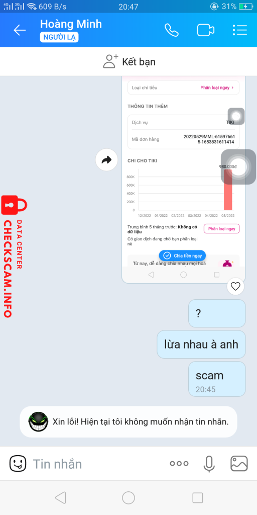 Cảnh báo kẻ lừa đảo: Hoàng Minh Đã báo cáo: November 16, 2024 Thông tin kẻ lừa đảo Họ và tên: Hoàng Minh Số điện thoại: 0582846774 Cổng thanh toán: MoMo Tài khoản thanh toán: 0582846774 Danh mục: Lừa đảo mua bán Nguồn: Checkscam Tệp bằng chứng Mô tả báo cáo Lừa đảo bằng ví trả sau Tpbank rồi chuyền về tiki Bình luận Bình luận của bạn Thêm bình luận Chưa có bình luận nào. Hãy là người đầu tiên chia sẻ kinh nghiệm của bạn với kẻ lừa đảo này.