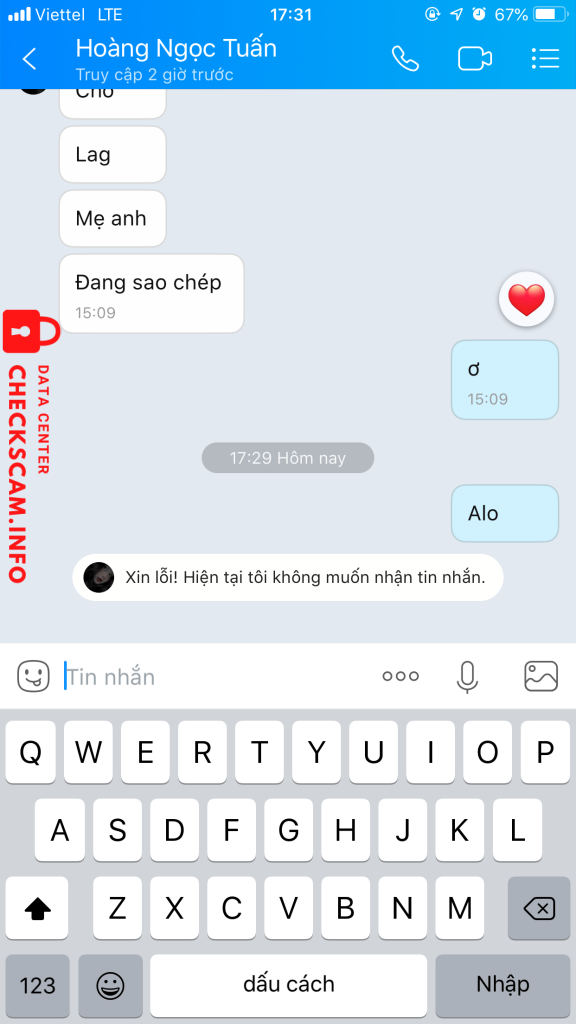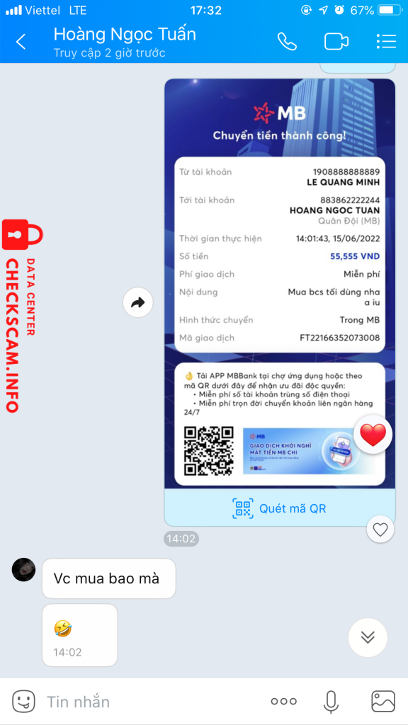 Cảnh báo kẻ lừa đảo: Hoàng Ngọc Tuấn Đã báo cáo: November 16, 2024 Thông tin kẻ lừa đảo Họ và tên: Hoàng Ngọc Tuấn Cổng thanh toán: MB Bank Tài khoản thanh toán: 883862222244 Danh mục: Lừa đảo mua bán Nguồn: Checkscam Tệp bằng chứng Mô tả báo cáo Nó nhận làm dvfb để lừa đảo Bình luận Bình luận của bạn Thêm bình luận Chưa có bình luận nào. Hãy là người đầu tiên chia sẻ kinh nghiệm của bạn với kẻ lừa đảo này.