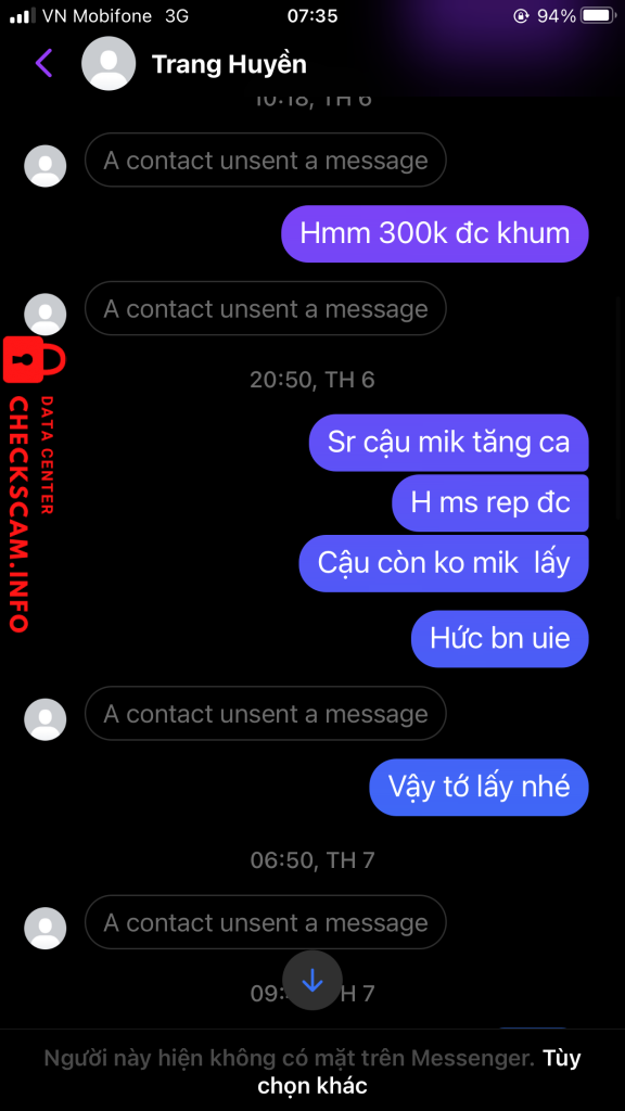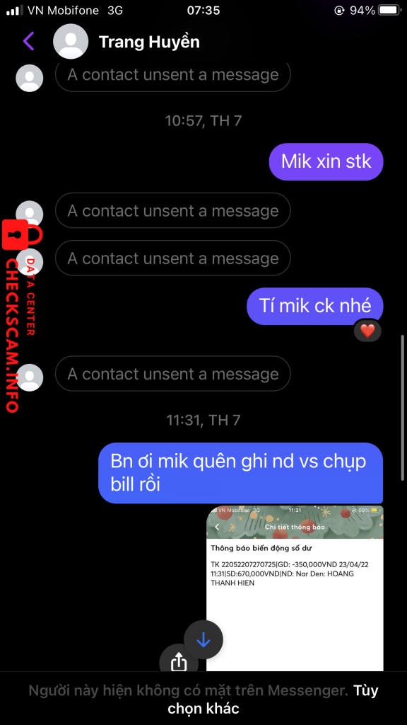 Cảnh báo kẻ lừa đảo: Hoang thanh hien Đã báo cáo: November 16, 2024 Thông tin kẻ lừa đảo Họ và tên: Hoang thanh hien Cổng thanh toán: Mb Tài khoản thanh toán: 32306300521994 Danh mục: Lừa đảo mua bán Nguồn: Checkscam Tệp bằng chứng Mô tả báo cáo Scam tôi 350k tiền truyện Bình luận Bình luận của bạn Thêm bình luận Chưa có bình luận nào. Hãy là người đầu tiên chia sẻ kinh nghiệm của bạn với kẻ lừa đảo này.