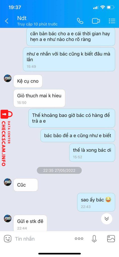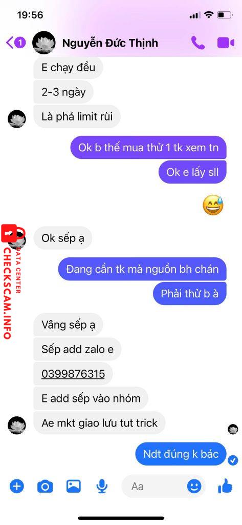 N còn dùng STK 05828239601 – NGUYEN DUC THINH – TPBANK. Chuyên gia lừa đảo, lùa gà, dùng nhiều STK ngân hàng khác nhau, add mọi người vào gruop zalo mà n là chủ nhóm để tạo tin tưởng. Lần đầu mua 1 tk thì đưa đúng hàng. Lần sau lấy nhiều giảm giá cái là bùng. Lấy lí do hết hàng nên đợi, đợi cả mấy hôm k thấy thì bảo refund, nhưng rồi cứ vòng vo này nọ cả tuần trời không thấy refund. Sau đó mình vào nhóm của n tố scam cái n kích mình ra khỏi nhóm đó luôn. Tên nhóm là “Tâm Sự Thầm Kín Tut Trick Fb Ads”, zalo n là Ntd, a e né ra !!!