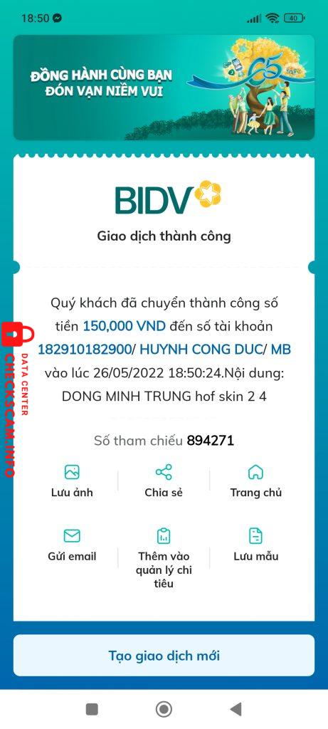 Cảnh báo kẻ lừa đảo: HUYNH CONG DUC Đã báo cáo: November 16, 2024 Thông tin kẻ lừa đảo Họ và tên: HUYNH CONG DUC Cổng thanh toán: MB Tài khoản thanh toán: 182910182900 Danh mục: Lừa đảo mua bán Nguồn: Checkscam Tệp bằng chứng Mô tả báo cáo Scam trong group mua bán acc game Honkai Impact Bình luận Bình luận của bạn Thêm bình luận Chưa có bình luận nào. Hãy là người đầu tiên chia sẻ kinh nghiệm của bạn với kẻ lừa đảo này.