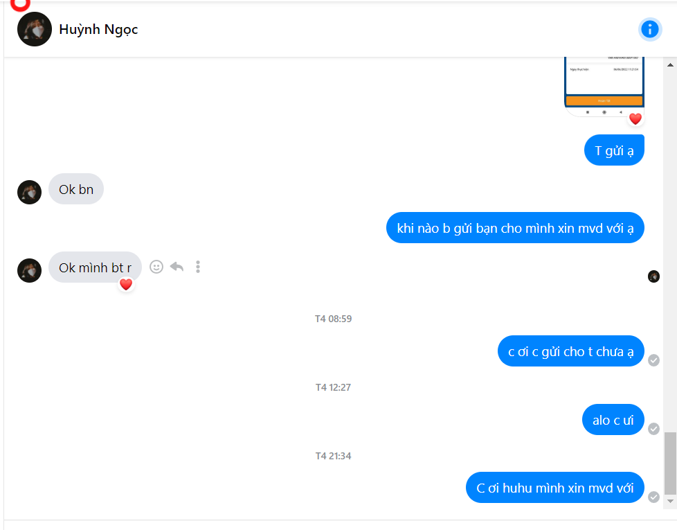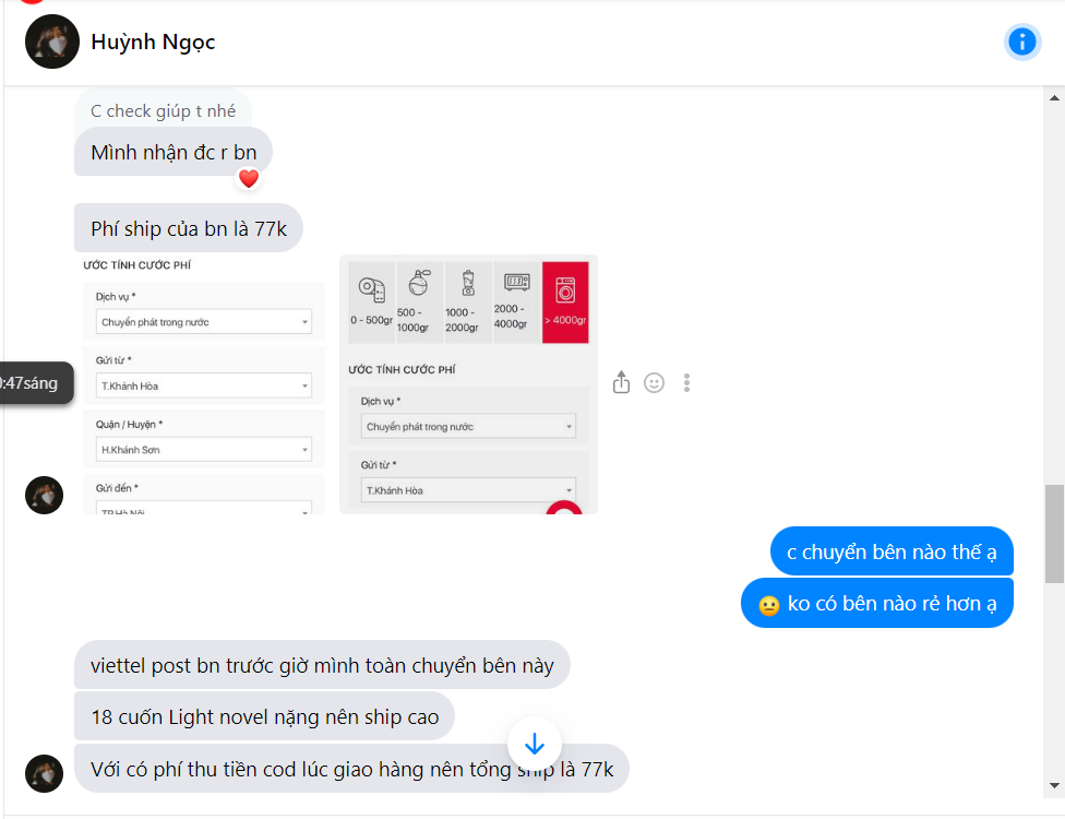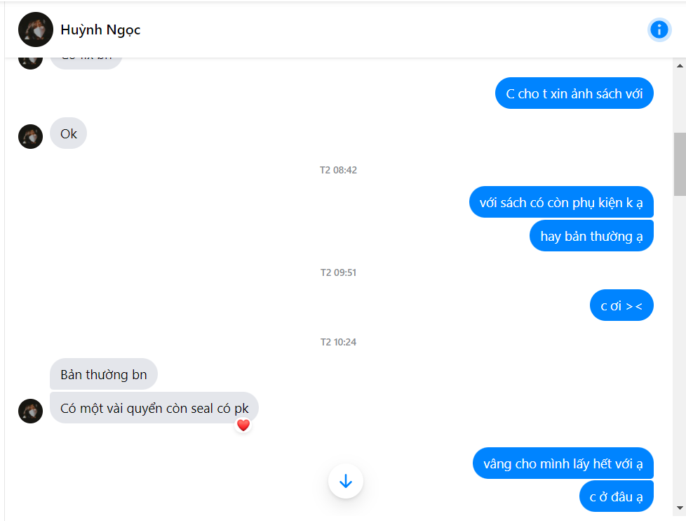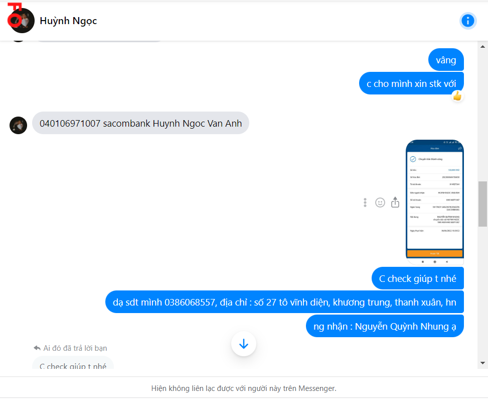 mình mua SAO của bạn này, bảo là ỏ Khánh Hòa nên ship cod có cọc. Lần đầu cọc 150k vẫn rất bth, xong bảo phí ship 18 quyển đắt quá ( 77k) nên nếu cọc thêm 250k nữa thì sẽ mất 20k ship thôi. Bank xong 2 hôm sau mất hút. Bạn này không đăng bài trên group, chỉ đi comment dạo trong bài họp chợ. Sau khi block mình thì xóa sạch cmt luôn