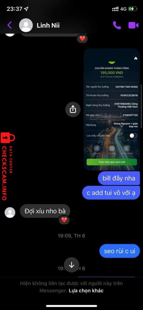 Cảnh báo kẻ lừa đảo: Huỳnh Tân Hùng Đã báo cáo: November 16, 2024 Thông tin kẻ lừa đảo Họ và tên: Huỳnh Tân Hùng Cổng thanh toán: Vietinbank Tài khoản thanh toán: 101812323678 Danh mục: Lừa đảo mua bán Nguồn: Checkscam Tệp bằng chứng Mô tả báo cáo Lừa đảo 15 triệu Bình luận Bình luận của bạn Thêm bình luận Chưa có bình luận nào. Hãy là người đầu tiên chia sẻ kinh nghiệm của bạn với kẻ lừa đảo này.