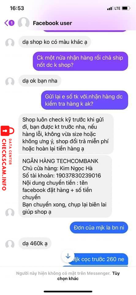 Cảnh báo kẻ lừa đảo: Kim Ngọc Hà Đã báo cáo: November 16, 2024 Thông tin kẻ lừa đảo Họ và tên: Kim Ngọc Hà Cổng thanh toán: Techcombank Tài khoản thanh toán: 19037830239016 Danh mục: Lừa đảo mua bán Nguồn: Checkscam Tệp bằng chứng Mô tả báo cáo Shop monday lừa đảo khách chuyển tiền nhưng không gửi hàng Bình luận Bình luận của bạn Thêm bình luận Chưa có bình luận nào. Hãy là người đầu tiên chia sẻ kinh nghiệm của bạn với kẻ lừa đảo này.