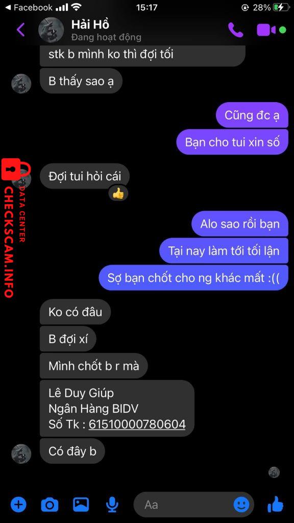 Cảnh báo kẻ lừa đảo: Lê Duy Giúp Đã báo cáo: November 16, 2024 Thông tin kẻ lừa đảo Họ và tên: Lê Duy Giúp Cổng thanh toán: BIDV Tài khoản thanh toán: 61510000780604 Danh mục: Lừa đảo mua bán Nguồn: Checkscam Tệp bằng chứng Mô tả báo cáo Lừa tiền Scam bán truyện Bình luận Bình luận của bạn Thêm bình luận Chưa có bình luận nào. Hãy là người đầu tiên chia sẻ kinh nghiệm của bạn với kẻ lừa đảo này.