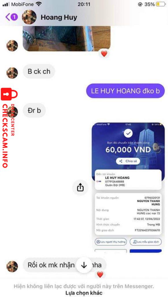 Cảnh báo kẻ lừa đảo: LE HUY HOANG Đã báo cáo: November 16, 2024 Thông tin kẻ lừa đảo Họ và tên: LE HUY HOANG Cổng thanh toán: MB bank Tài khoản thanh toán: 077912648888 Danh mục: Lừa đảo mua bán Nguồn: Checkscam Tệp bằng chứng Mô tả báo cáo Lừa đảo, chuyển khoản xong chặn Bình luận Bình luận của bạn Thêm bình luận Chưa có bình luận nào. Hãy là người đầu tiên chia sẻ kinh nghiệm của bạn với kẻ lừa đảo này.
