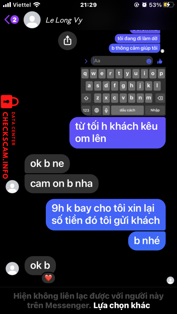 Cảnh báo kẻ lừa đảo: Lê Long Vỹ Đã báo cáo: November 16, 2024 Thông tin kẻ lừa đảo Họ và tên: Lê Long Vỹ Số điện thoại: 0946055211 Cổng thanh toán: momo Tài khoản thanh toán: 0946055211 Danh mục: Lừa đảo mua bán Nguồn: Checkscam Tệp bằng chứng Mô tả báo cáo nhận được tiền+ bị chặn ních Bình luận Bình luận của bạn Thêm bình luận Chưa có bình luận nào. Hãy là người đầu tiên chia sẻ kinh nghiệm của bạn với kẻ lừa đảo này.