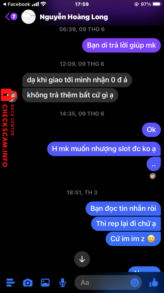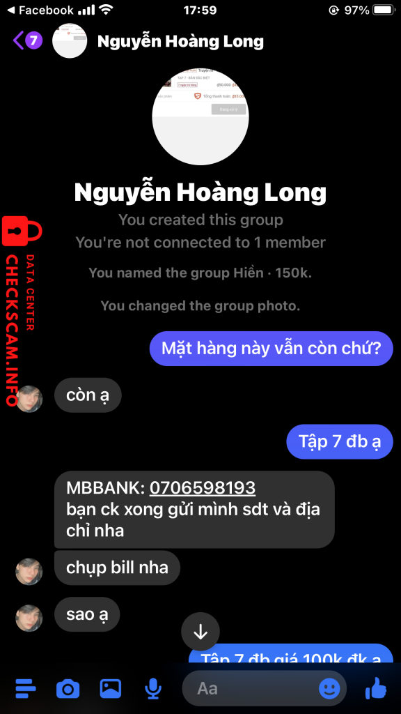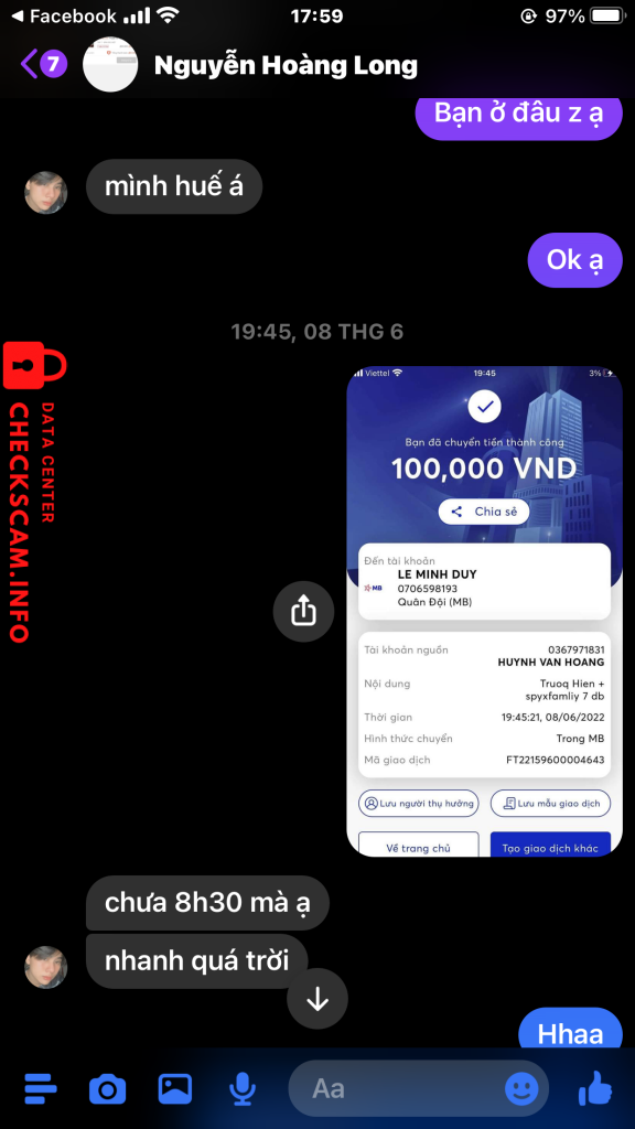 Cảnh báo kẻ lừa đảo: Le Minh Duy Đã báo cáo: November 16, 2024 Thông tin kẻ lừa đảo Họ và tên: Le Minh Duy Cổng thanh toán: MB Bank Tài khoản thanh toán: 0706598193 Danh mục: Lừa đảo mua bán Nguồn: Checkscam Tệp bằng chứng Mô tả báo cáo Lừa đảo 100.000₫ truyện Spyxfamliy tập 7 đặc biệt. Nhắn tin không có trả lời Bình luận Bình luận của bạn Thêm bình luận Chưa có bình luận nào. Hãy là người đầu tiên chia sẻ kinh nghiệm của bạn với kẻ lừa đảo này.