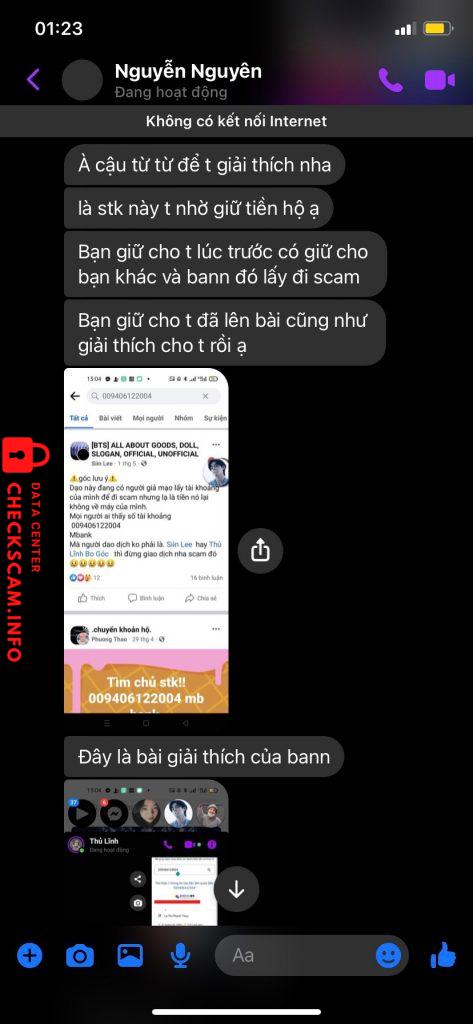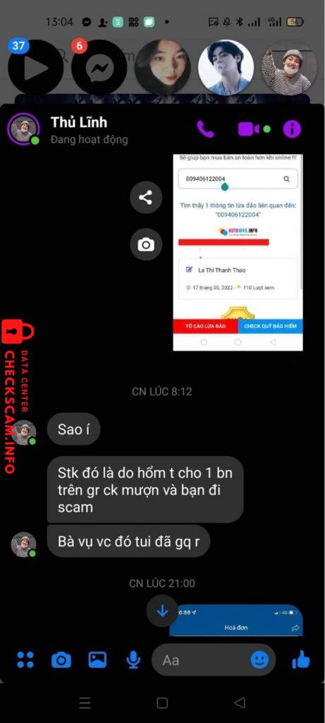 STK trên bill tui cap lại là nick FB của bạn: Thủ Lĩnh Bo Góc; hiện đang giữ tiền hộ nó và sẽ giải quyết refund cho các bạn. Nếu bạn chuyển khoản cho tài khoản tên LÊ THỊ THANH THẢO thì tìm nick này để được giải quyết. Tra webscam mà có tên thì tốt nhất nên té ngay và luôn, đừng nghe giải thích mà tin như tui nha mấy bạn?