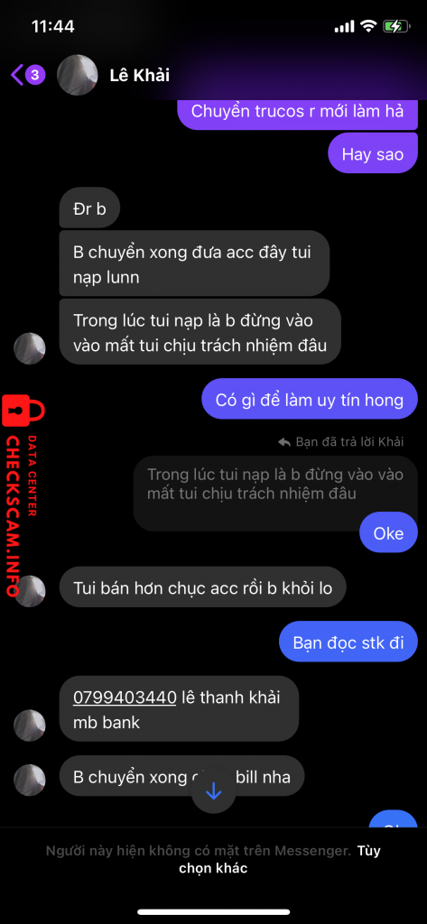 Cảnh báo kẻ lừa đảo: lê thanh khải Đã báo cáo: November 16, 2024 Thông tin kẻ lừa đảo Họ và tên: lê thanh khải Cổng thanh toán: (Mb)bank Tài khoản thanh toán: 0799403440 Danh mục: Lừa đảo mua bán Nguồn: Checkscam Tệp bằng chứng Mô tả báo cáo Lừa đảo buôn bán quân huy Bình luận Bình luận của bạn Thêm bình luận Chưa có bình luận nào. Hãy là người đầu tiên chia sẻ kinh nghiệm của bạn với kẻ lừa đảo này.