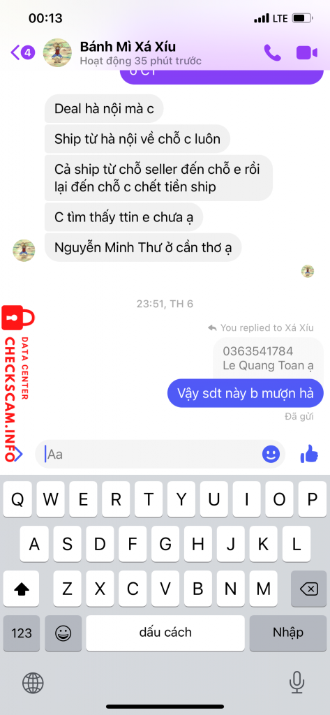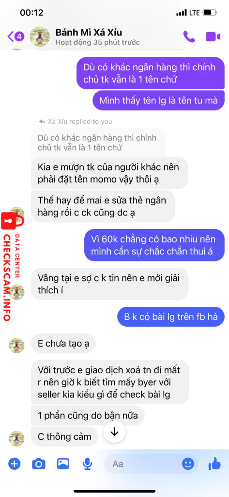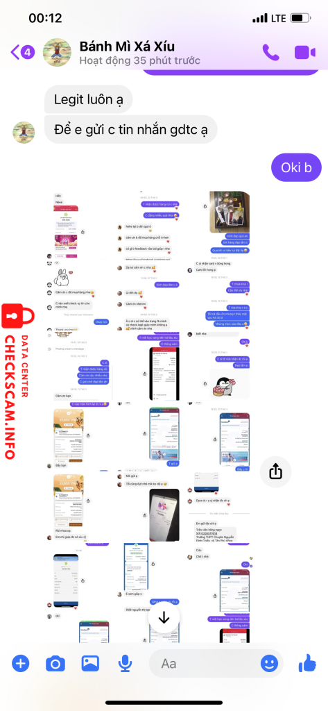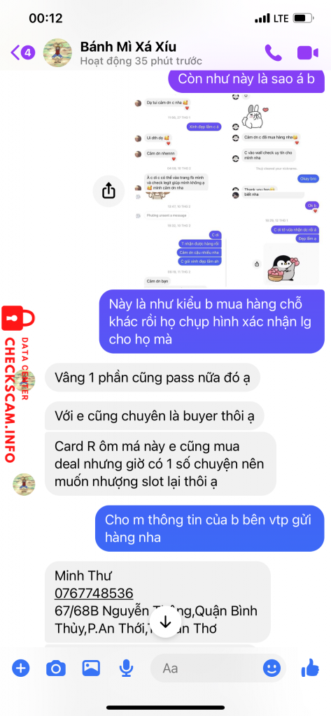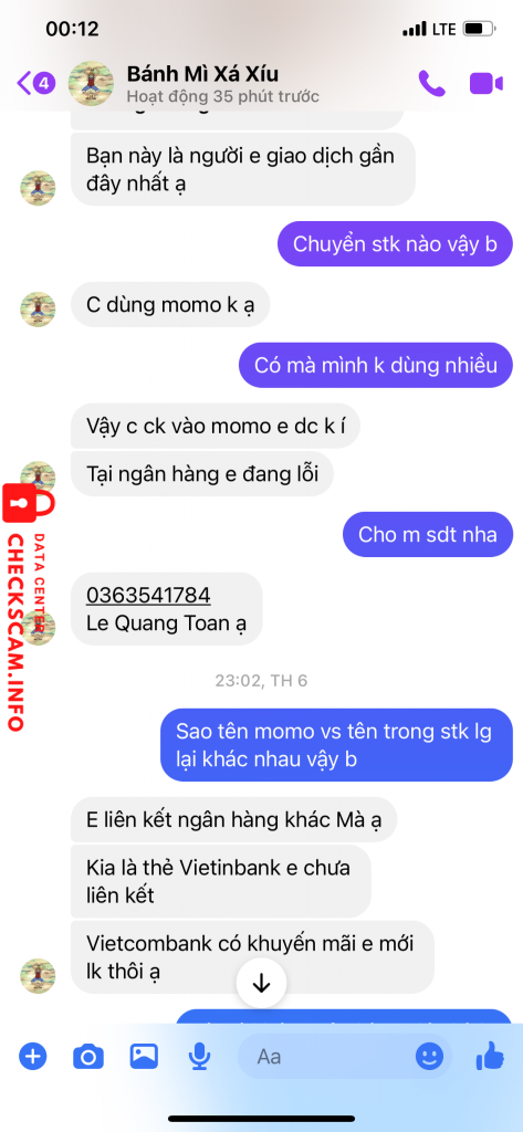 sđt momo, stk gd trong các hình lg, tt gửi hàng vtp và sdt ng nhận hàng đều hoàn toàn không trùng với nhau và thế mình check toàn bộ các gr thì không có scam nhưng check wed mãi mới ra dính scam nick fb Bánh Mì Xíu Mại
