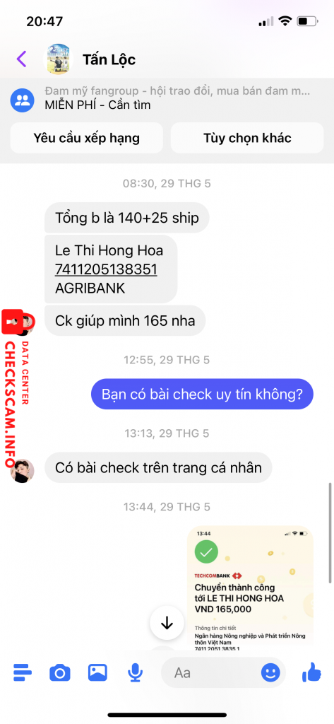 Cảnh báo kẻ lừa đảo: Le thi hong hoa Đã báo cáo: November 16, 2024 Thông tin kẻ lừa đảo Họ và tên: Le thi hong hoa Cổng thanh toán: AGRIBANK Tài khoản thanh toán: 7411205138351 Danh mục: Lừa đảo mua bán Nguồn: Checkscam Tệp bằng chứng Mô tả báo cáo Scam quyển 2gether tập 1. Lấy ảnh mạng giả vờ của mình để lừa đảo. Bình luận Bình luận của bạn Thêm bình luận Chưa có bình luận nào. Hãy là người đầu tiên chia sẻ kinh nghiệm của bạn với kẻ lừa đảo này.