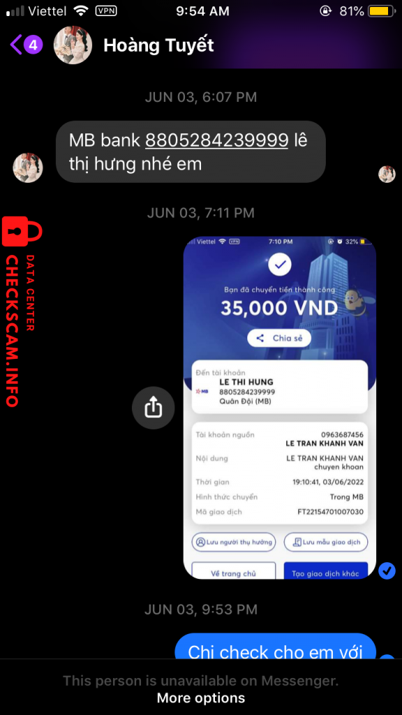 Cảnh báo kẻ lừa đảo: Le thi hung Đã báo cáo: November 16, 2024 Thông tin kẻ lừa đảo Họ và tên: Le thi hung Cổng thanh toán: Mb bank Tài khoản thanh toán: 8805284239999 Danh mục: Lừa đảo mua bán Nguồn: Checkscam Tệp bằng chứng Mô tả báo cáo Lừa đảo nạn nhân bằng cv tuyển ctv Bình luận Bình luận của bạn Thêm bình luận Chưa có bình luận nào. Hãy là người đầu tiên chia sẻ kinh nghiệm của bạn với kẻ lừa đảo này.