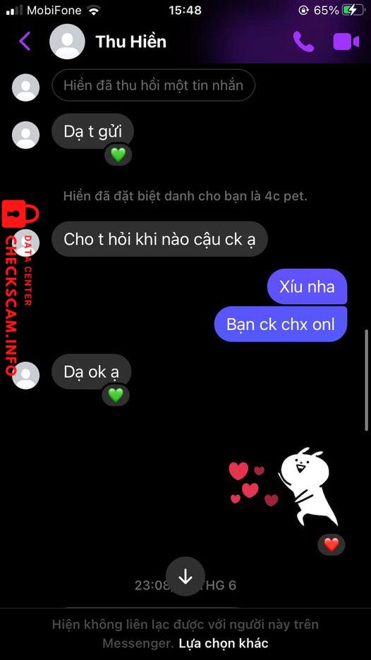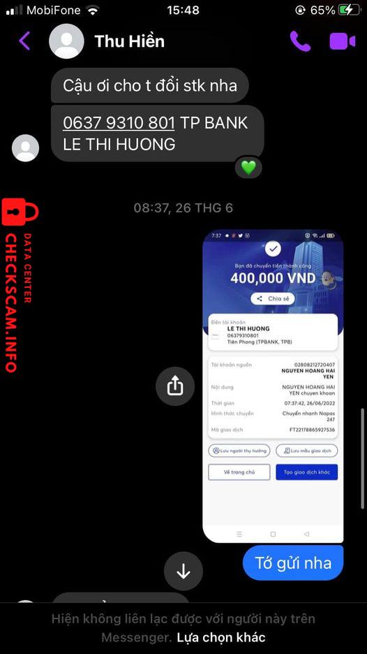 Cảnh báo kẻ lừa đảo: LE THI HUONG Đã báo cáo: November 16, 2024 Thông tin kẻ lừa đảo Họ và tên: LE THI HUONG Cổng thanh toán: TP BANK Tài khoản thanh toán: 06379310801 Danh mục: Lừa đảo mua bán Nguồn: Checkscam Tệp bằng chứng Mô tả báo cáo Lừa đảo về việc buôn bán goods Thái Lan Bình luận Bình luận của bạn Thêm bình luận Chưa có bình luận nào. Hãy là người đầu tiên chia sẻ kinh nghiệm của bạn với kẻ lừa đảo này.