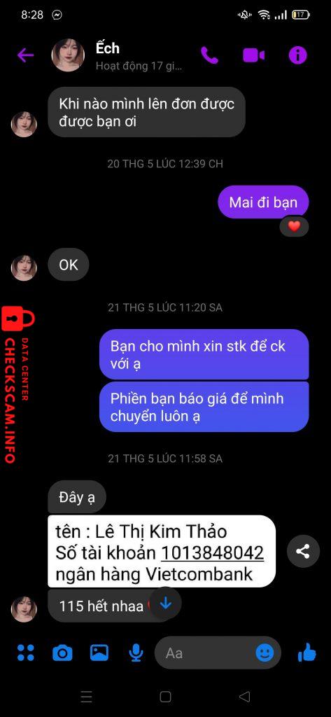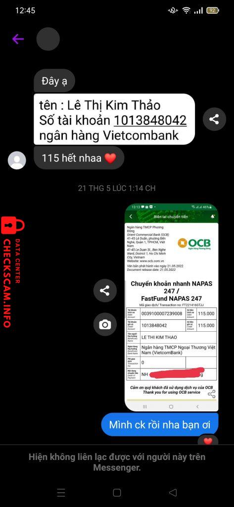 Cảnh báo kẻ lừa đảo: Lê Thị Kim Thảo Đã báo cáo: November 16, 2024 Thông tin kẻ lừa đảo Họ và tên: Lê Thị Kim Thảo Cổng thanh toán: Vietcombank Tài khoản thanh toán: 1013848042 Danh mục: Lừa đảo mua bán Nguồn: Checkscam Tệp bằng chứng Mô tả báo cáo Bình luận Bình luận của bạn Thêm bình luận Chưa có bình luận nào. Hãy là người đầu tiên chia sẻ kinh nghiệm của bạn với kẻ lừa đảo này.