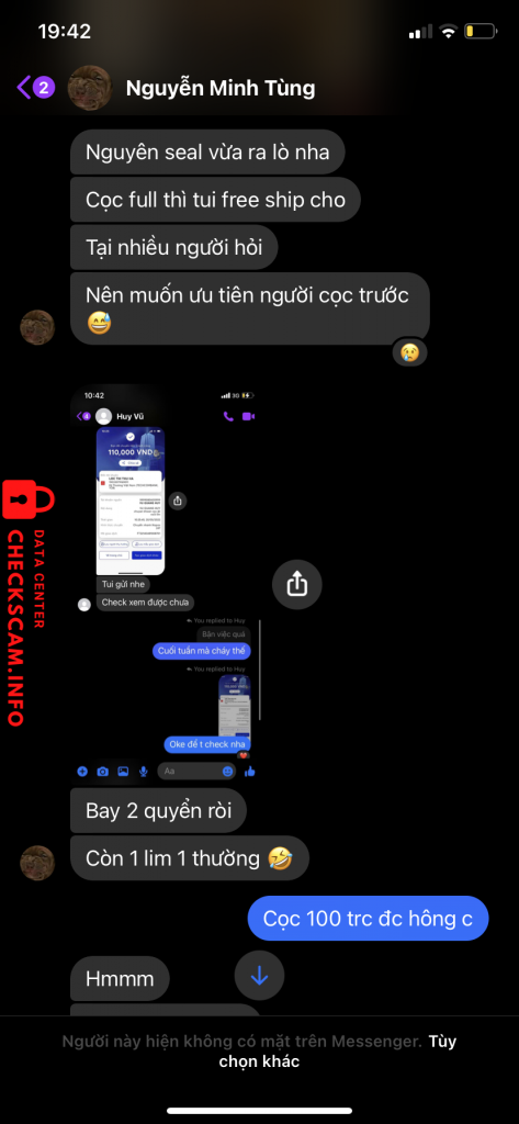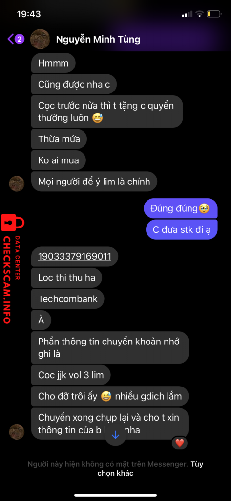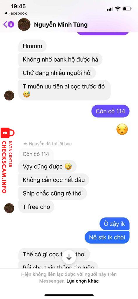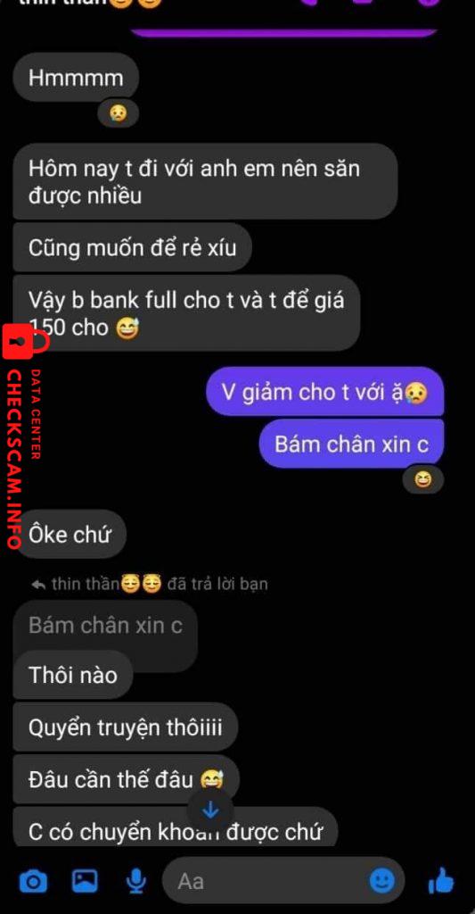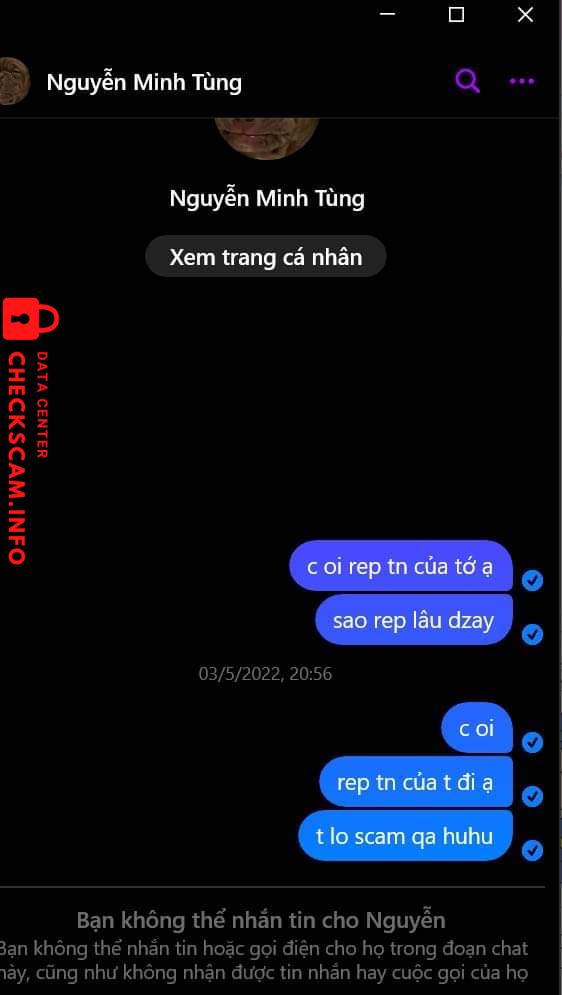 Cảnh báo kẻ lừa đảo: Loc thi thu ha Đã báo cáo: November 16, 2024 Thông tin kẻ lừa đảo Họ và tên: Loc thi thu ha Cổng thanh toán: techcombank Tài khoản thanh toán: 19033379169011 Danh mục: Lừa đảo mua bán Nguồn: Checkscam Tệp bằng chứng Mô tả báo cáo Bạn này có fb là Nguyễn Minh Tùng để avatar con chó, đã scam 4 bạn trong đó có tớ 668k và bạn đó có rất nhiều tk ngân hàng nên mn lưu ý Bình luận Bình luận của bạn Thêm bình luận Chưa có bình luận nào. Hãy là người đầu tiên chia sẻ kinh nghiệm của bạn với kẻ lừa đảo này.