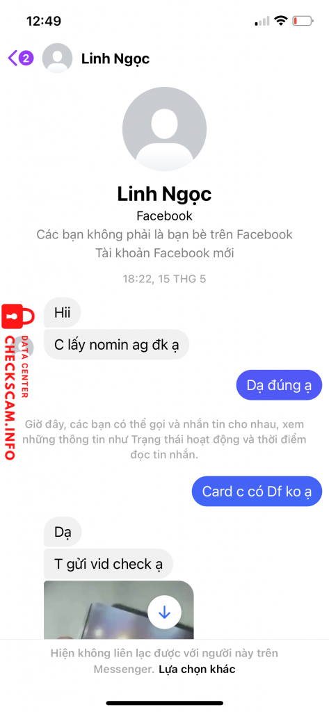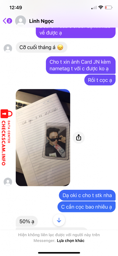 Cảnh báo kẻ lừa đảo: Ngô Sĩ Tiến Đã báo cáo: November 16, 2024 Thông tin kẻ lừa đảo Họ và tên: Ngô Sĩ Tiến Cổng thanh toán: MB BANK Tài khoản thanh toán: 0378422813 Danh mục: Lừa đảo mua bán Nguồn: Checkscam Tệp bằng chứng Mô tả báo cáo Lừa đảo trong group fan NCT Bình luận Bình luận của bạn Thêm bình luận Chưa có bình luận nào. Hãy là người đầu tiên chia sẻ kinh nghiệm của bạn với kẻ lừa đảo này.