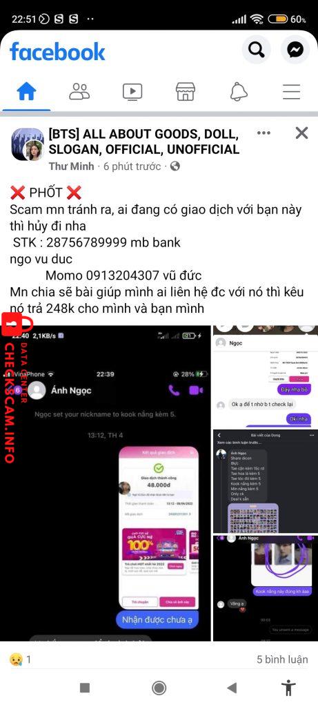 Cảnh báo kẻ lừa đảo: NGO VU DUC Đã báo cáo: November 16, 2024 Thông tin kẻ lừa đảo Họ và tên: NGO VU DUC Cổng thanh toán: MB Bank Tài khoản thanh toán: 28756789999 Danh mục: Lừa đảo mua bán Nguồn: Checkscam Tệp bằng chứng Mô tả báo cáo Xì cam mơ mới nổi 🙂 Scam trong gr mua bán card good BTS. Bình luận Bình luận của bạn Thêm bình luận Chưa có bình luận nào. Hãy là người đầu tiên chia sẻ kinh nghiệm của bạn với kẻ lừa đảo này.