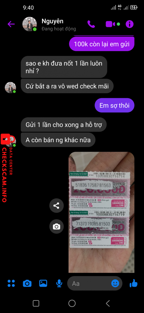 Cảnh báo kẻ lừa đảo: Nguyên Đã báo cáo: November 16, 2024 Thông tin kẻ lừa đảo Họ và tên: Nguyên Cổng thanh toán: Momo Tài khoản thanh toán: 0793912066 Danh mục: Lừa đảo mua bán Nguồn: Checkscam Tệp bằng chứng Mô tả báo cáo Bán acc liên quân scam tiền Bình luận Bình luận của bạn Thêm bình luận Chưa có bình luận nào. Hãy là người đầu tiên chia sẻ kinh nghiệm của bạn với kẻ lừa đảo này.