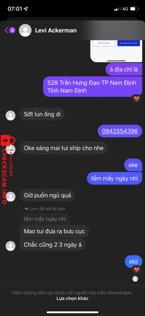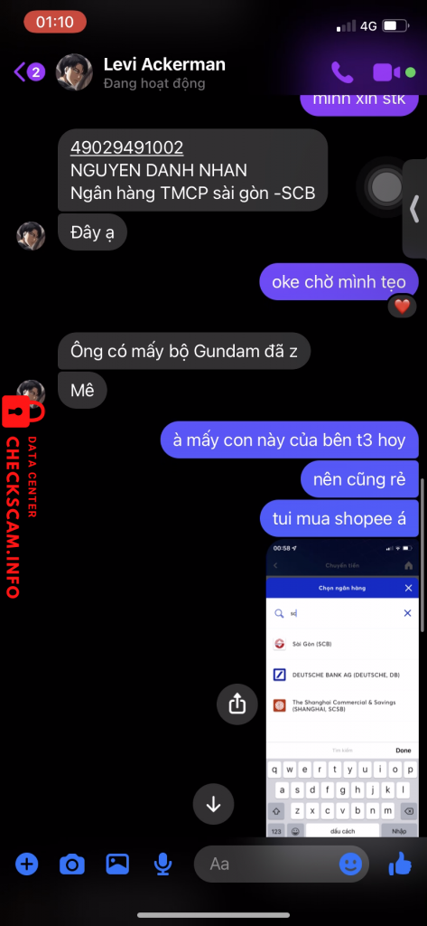 Cảnh báo kẻ lừa đảo: NGUYEN DANH NHAN Đã báo cáo: November 16, 2024 Thông tin kẻ lừa đảo Họ và tên: NGUYEN DANH NHAN Cổng thanh toán: Sài Gòn (SCB) Tài khoản thanh toán: 49029491002 Danh mục: Lừa đảo mua bán Nguồn: Checkscam Tệp bằng chứng Mô tả báo cáo ck tiền rồi chặn fb Bình luận Bình luận của bạn Thêm bình luận Chưa có bình luận nào. Hãy là người đầu tiên chia sẻ kinh nghiệm của bạn với kẻ lừa đảo này.