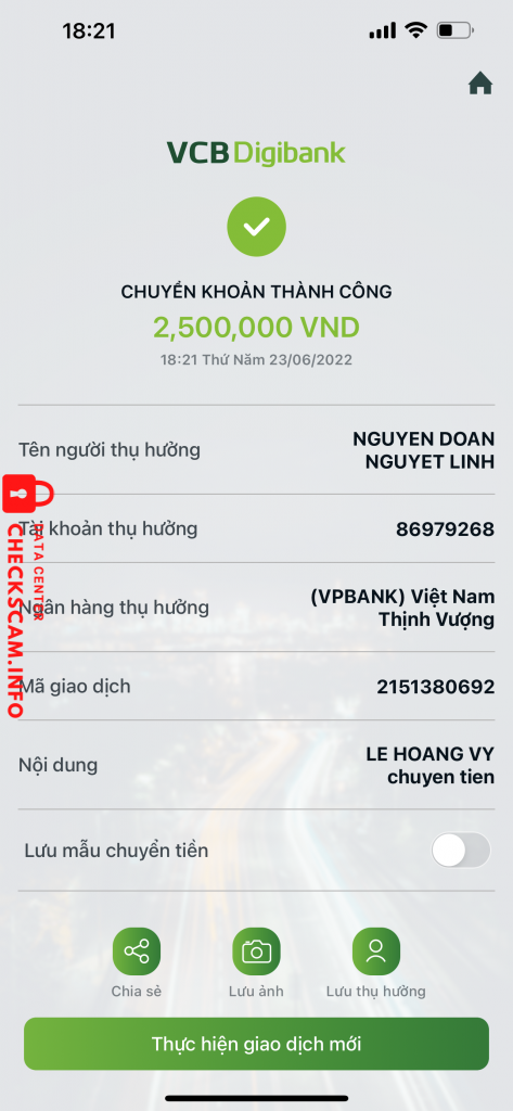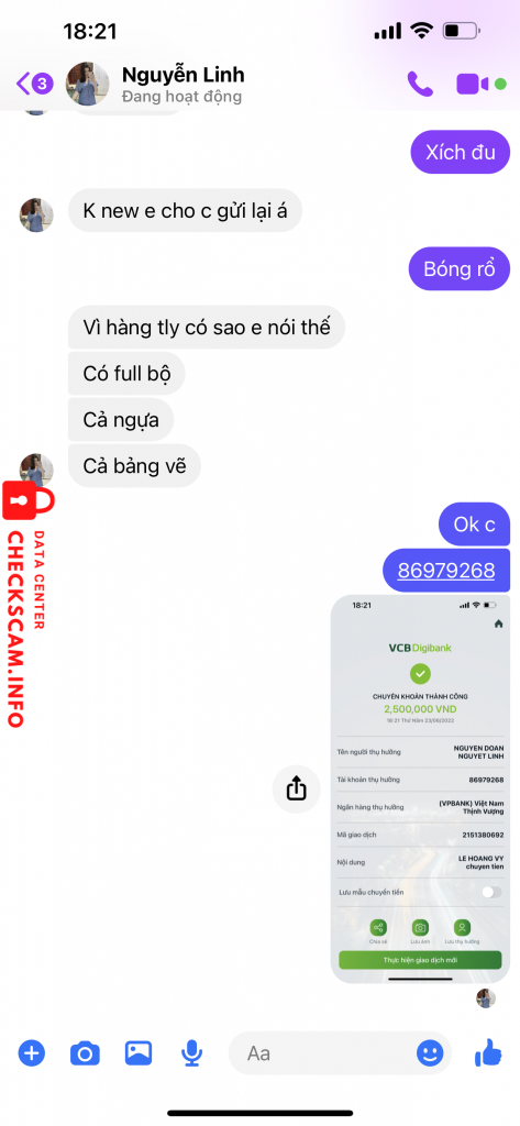 Cảnh báo kẻ lừa đảo: Nguyễn Đoàn Nguyệt Linh Đã báo cáo: November 16, 2024 Thông tin kẻ lừa đảo Họ và tên: Nguyễn Đoàn Nguyệt Linh Cổng thanh toán: Vp Bank Tài khoản thanh toán: 86979268 Danh mục: Lừa đảo mua bán Nguồn: Checkscam Tệp bằng chứng Mô tả báo cáo E có mua bộ quây cũi cho bé nhà e,c ấy nói c ấy pass lại giá 2500k…e ck hôm 23/06 tới h c ấy chặn luôn fb e Bình luận Bình luận của bạn Thêm bình luận Chưa có bình luận nào. Hãy là người đầu tiên chia sẻ kinh nghiệm của bạn với kẻ lừa đảo này.