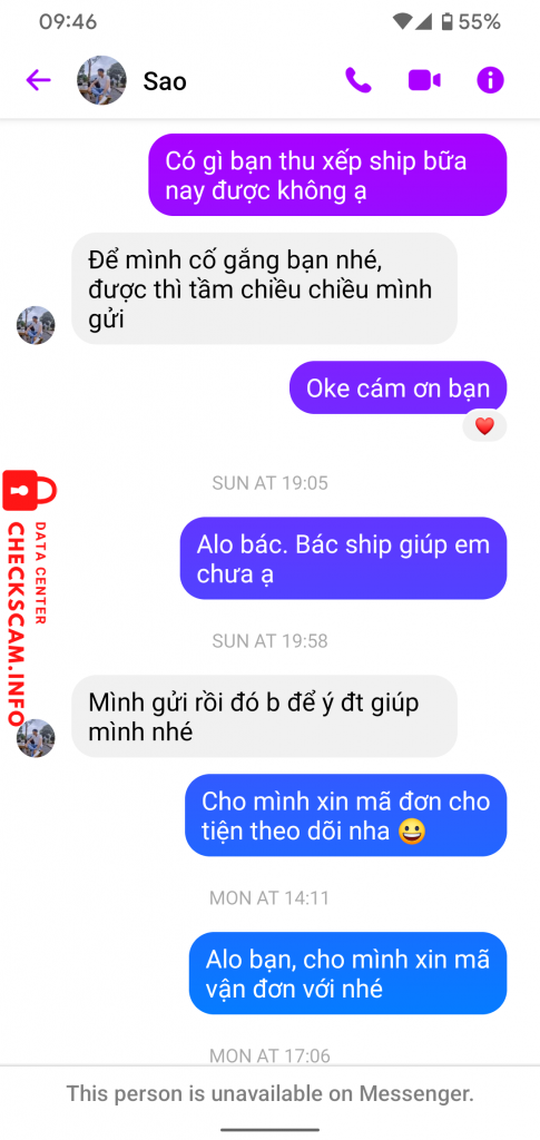 Cảnh báo kẻ lừa đảo: Nguyen Duc Sao Đã báo cáo: November 16, 2024 Thông tin kẻ lừa đảo Họ và tên: Nguyen Duc Sao Cổng thanh toán: MB Bank Tài khoản thanh toán: 0189948599999 Danh mục: Lừa đảo mua bán Nguồn: Checkscam Tệp bằng chứng Mô tả báo cáo Lừa đảo. NGUYEN DUC SAO STK MB BANK : 0189948699999 Bình luận Bình luận của bạn Thêm bình luận Chưa có bình luận nào. Hãy là người đầu tiên chia sẻ kinh nghiệm của bạn với kẻ lừa đảo này.