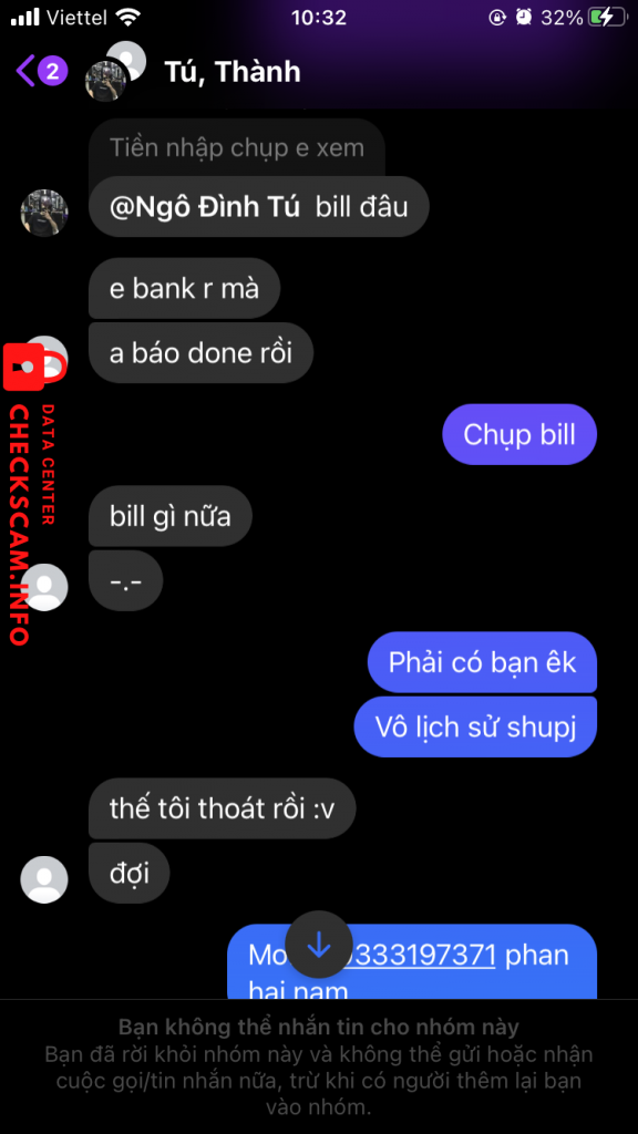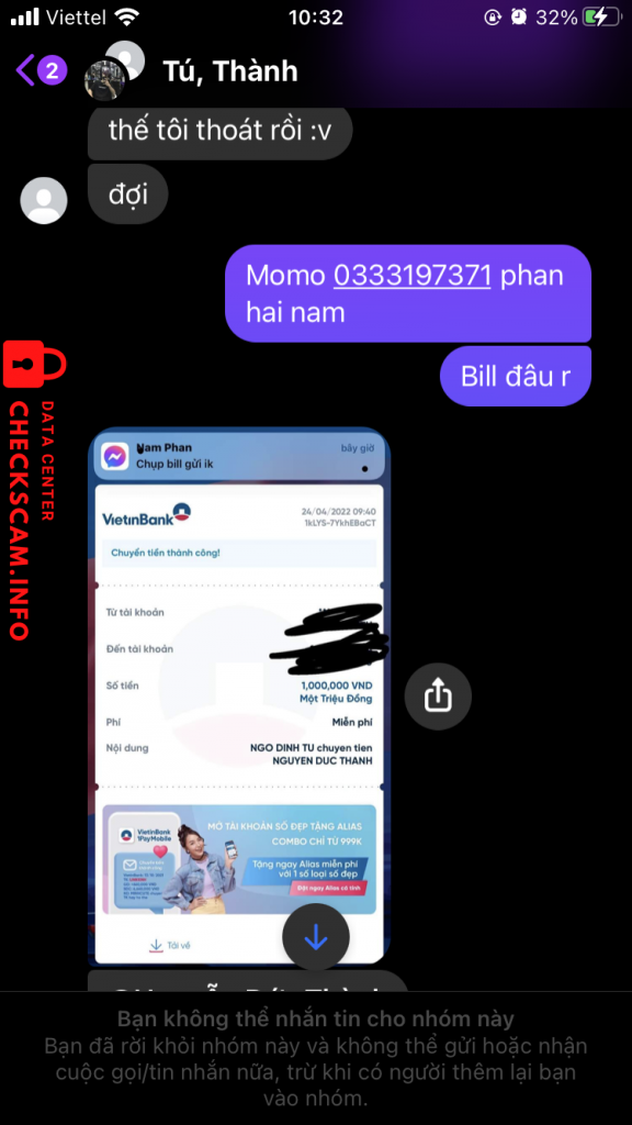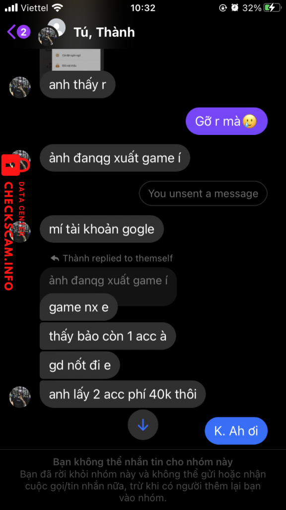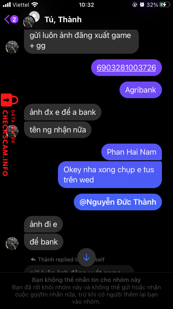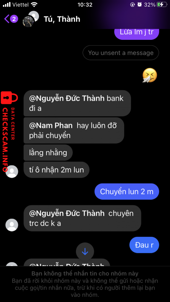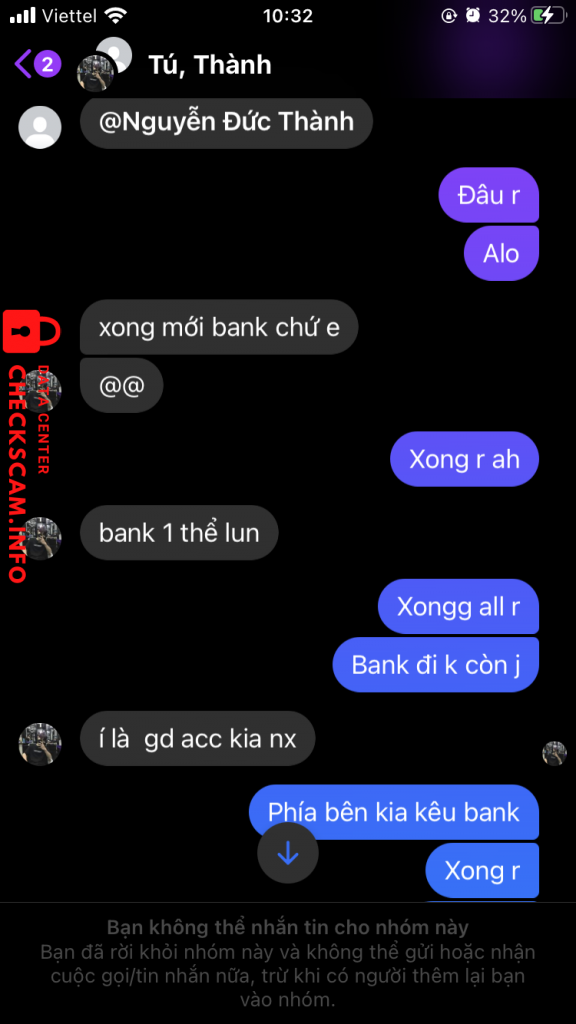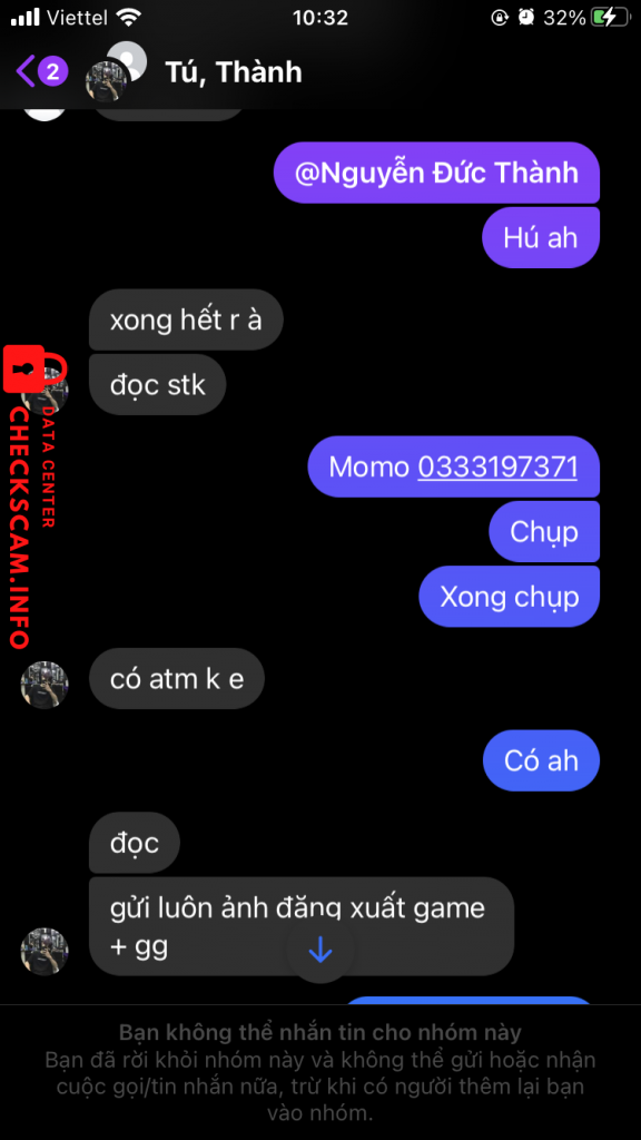 Cảnh báo kẻ lừa đảo: Nguyễn Đức Thành Đã báo cáo: November 16, 2024 Thông tin kẻ lừa đảo Họ và tên: Nguyễn Đức Thành Cổng thanh toán: BIDV Tài khoản thanh toán: 42510001519842 Danh mục: Lừa đảo mua bán Nguồn: Checkscam Tệp bằng chứng Mô tả báo cáo Lừa đảo chiếm đoạt 1tr5 Bình luận Bình luận của bạn Thêm bình luận Chưa có bình luận nào. Hãy là người đầu tiên chia sẻ kinh nghiệm của bạn với kẻ lừa đảo này.