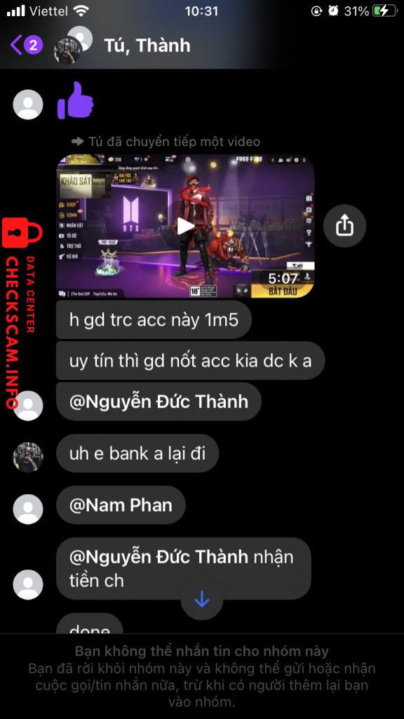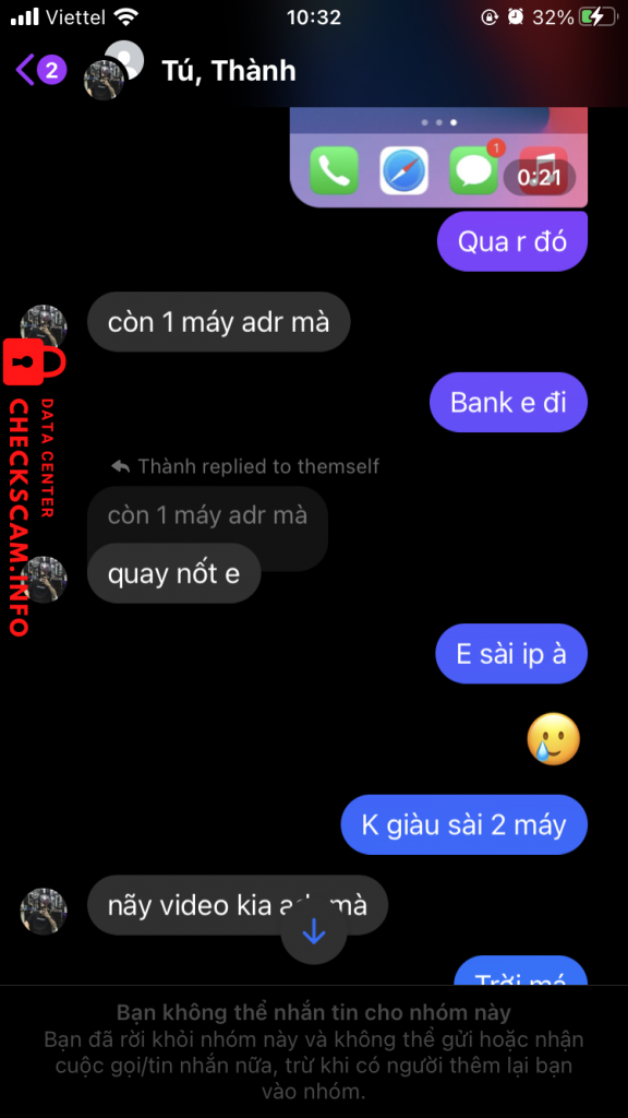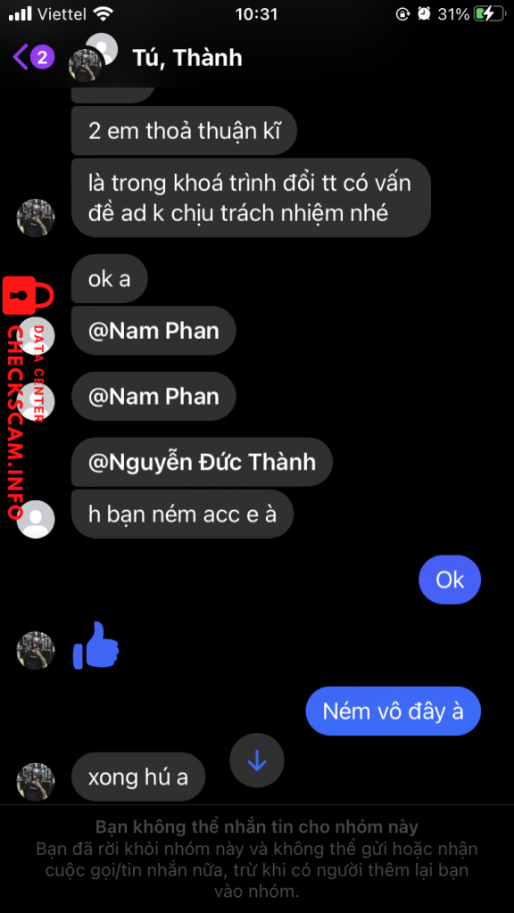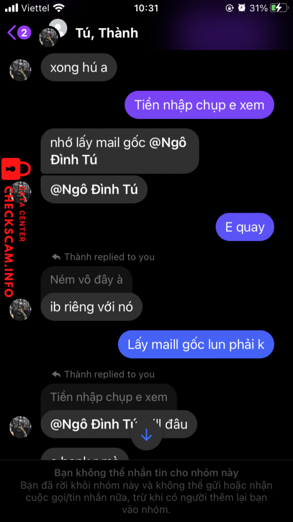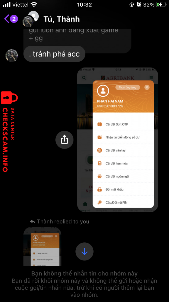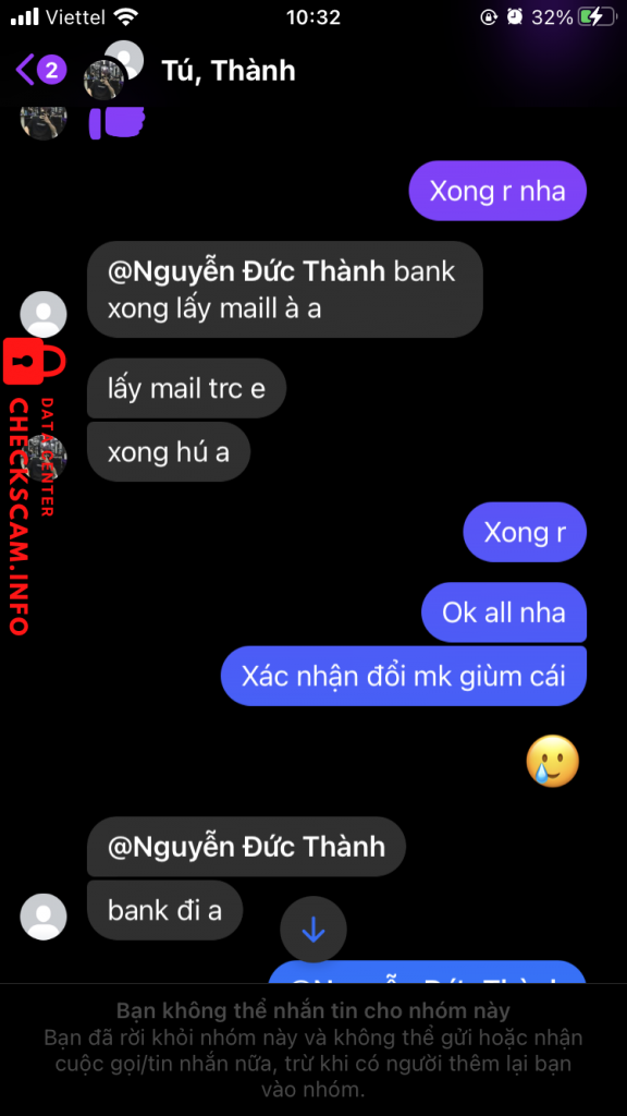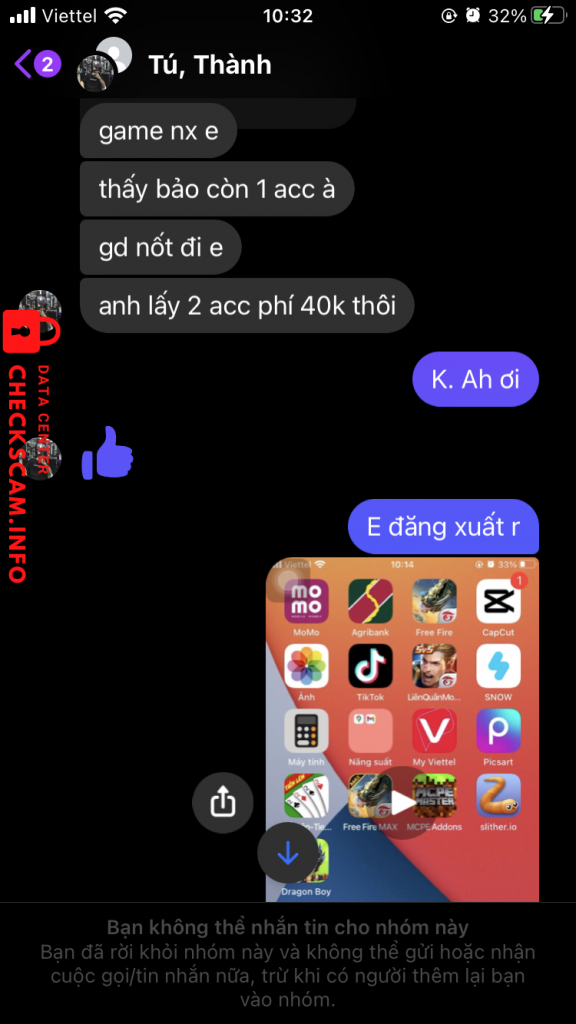 Cảnh báo kẻ lừa đảo: Nguyễn Đức Thành Đã báo cáo: November 16, 2024 Thông tin kẻ lừa đảo Họ và tên: Nguyễn Đức Thành Cổng thanh toán: BIDV Tài khoản thanh toán: 42510001519842 Danh mục: Lừa đảo mua bán Nguồn: Checkscam Tệp bằng chứng Mô tả báo cáo Lừa đảo chiếm đoạt 1tr5 Bình luận Bình luận của bạn Thêm bình luận Chưa có bình luận nào. Hãy là người đầu tiên chia sẻ kinh nghiệm của bạn với kẻ lừa đảo này.