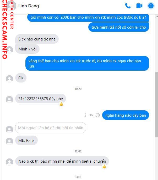 Cảnh báo kẻ lừa đảo: Nguyen Minh Hoang Đã báo cáo: November 16, 2024 Thông tin kẻ lừa đảo Họ và tên: Nguyen Minh Hoang Cổng thanh toán: MB BANK Tài khoản thanh toán: 31412232456578 Danh mục: Lừa đảo mua bán Nguồn: Checkscam Tệp bằng chứng Mô tả báo cáo Lừa gạt chiếm đoạt tài sản của người vô tội Bình luận Bình luận của bạn Thêm bình luận Chưa có bình luận nào. Hãy là người đầu tiên chia sẻ kinh nghiệm của bạn với kẻ lừa đảo này.
