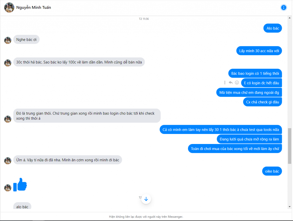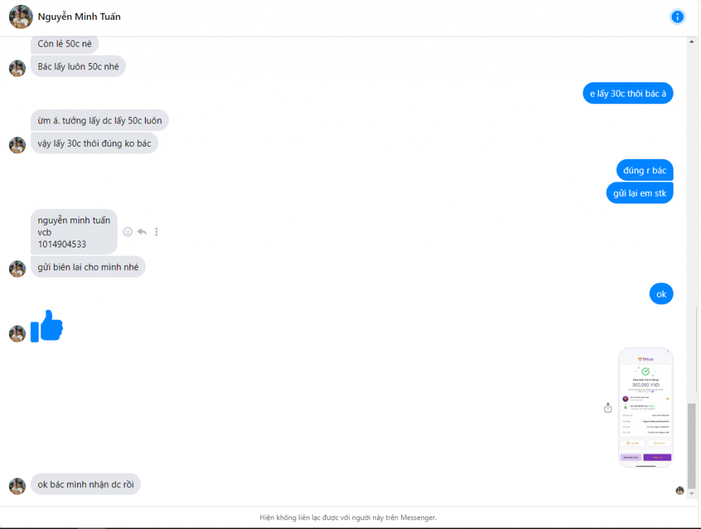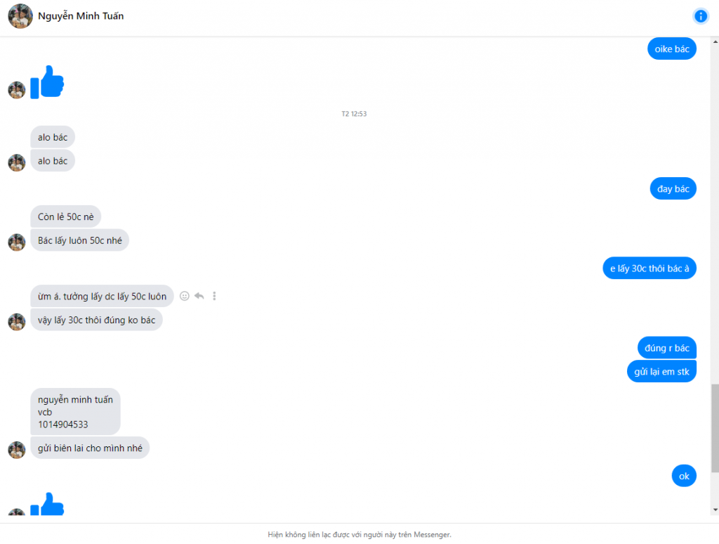 Cảnh báo kẻ lừa đảo: Nguyễn Minh Tuấn Đã báo cáo: November 16, 2024 Thông tin kẻ lừa đảo Họ và tên: Nguyễn Minh Tuấn Cổng thanh toán: vietcombank Tài khoản thanh toán: 1014904533 Danh mục: Lừa đảo mua bán Nguồn: Checkscam Tệp bằng chứng Mô tả báo cáo lừa bán mua bán via facebook Bình luận Bình luận của bạn Thêm bình luận Chưa có bình luận nào. Hãy là người đầu tiên chia sẻ kinh nghiệm của bạn với kẻ lừa đảo này.