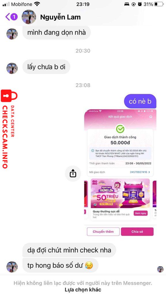Cảnh báo kẻ lừa đảo: Nguyễn Nhật Lâm Đã báo cáo: November 16, 2024 Thông tin kẻ lừa đảo Họ và tên: Nguyễn Nhật Lâm Cổng thanh toán: TP bank Tài khoản thanh toán: 04232955701 Danh mục: Lừa đảo mua bán Nguồn: Checkscam Tệp bằng chứng Mô tả báo cáo bạn mình nó mua nhóm zalo xong bị ông này lừa . mọi người cẩn thận nó nhé Bình luận Bình luận của bạn Thêm bình luận Chưa có bình luận nào. Hãy là người đầu tiên chia sẻ kinh nghiệm của bạn với kẻ lừa đảo này.