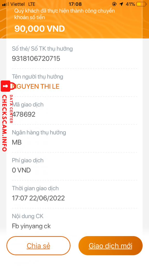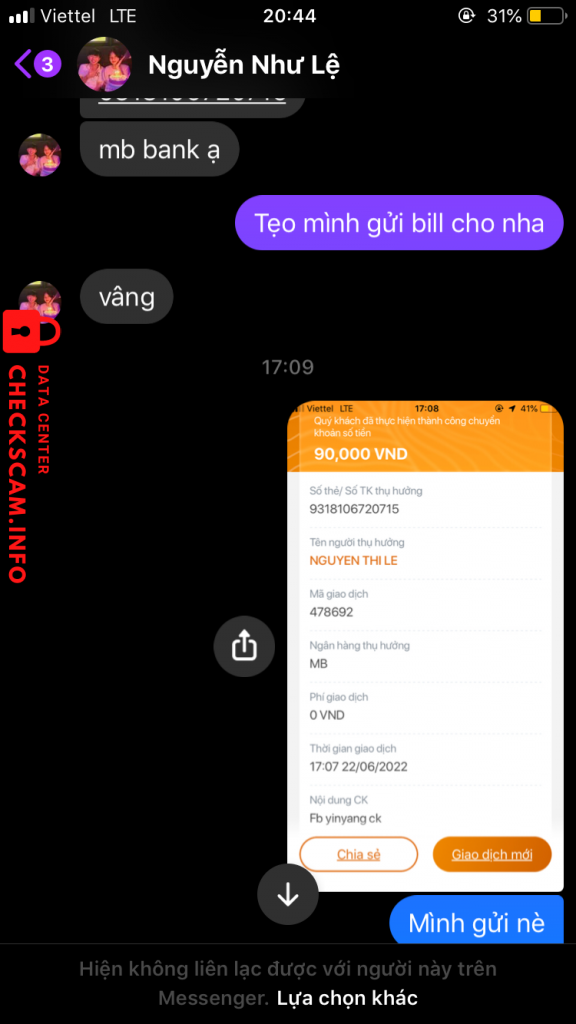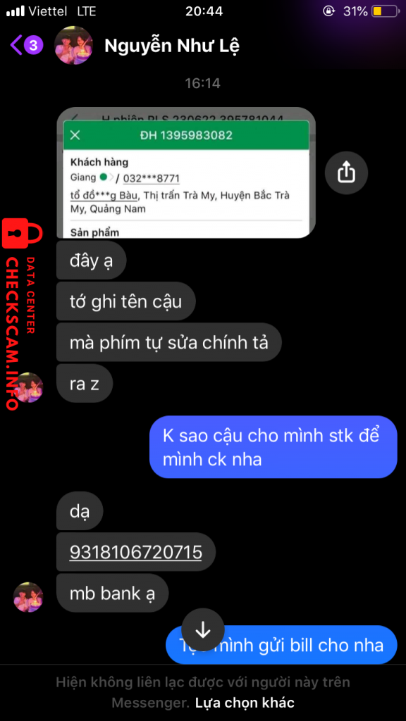 Cảnh báo kẻ lừa đảo: Nguyễn Như Lệ Đã báo cáo: November 16, 2024 Thông tin kẻ lừa đảo Họ và tên: Nguyễn Như Lệ Cổng thanh toán: Mb Tài khoản thanh toán: 9318106720715 Danh mục: Lừa đảo mua bán Nguồn: Checkscam Tệp bằng chứng Mô tả báo cáo Scam Bình luận Bình luận của bạn Thêm bình luận Chưa có bình luận nào. Hãy là người đầu tiên chia sẻ kinh nghiệm của bạn với kẻ lừa đảo này.