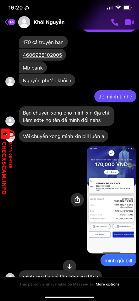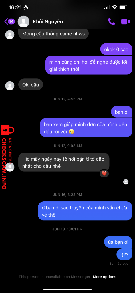 Cảnh báo kẻ lừa đảo: Nguyen Phuoc Khoi Đã báo cáo: November 16, 2024 Thông tin kẻ lừa đảo Họ và tên: Nguyen Phuoc Khoi Cổng thanh toán: MB Bank Tài khoản thanh toán: 4606928102005 Danh mục: Lừa đảo mua bán Nguồn: Checkscam Tệp bằng chứng Mô tả báo cáo Mình mua lại sxf 7 của bạn này bằng cách đổi địa chỉ trên shopee nhưng mãi chưa thấy về (nửa tháng) vào ib thì thấy 0 nhắn được nữa Bình luận Bình luận của bạn Thêm bình luận Chưa có bình luận nào. Hãy là người đầu tiên chia sẻ kinh nghiệm của bạn với kẻ lừa đảo này.